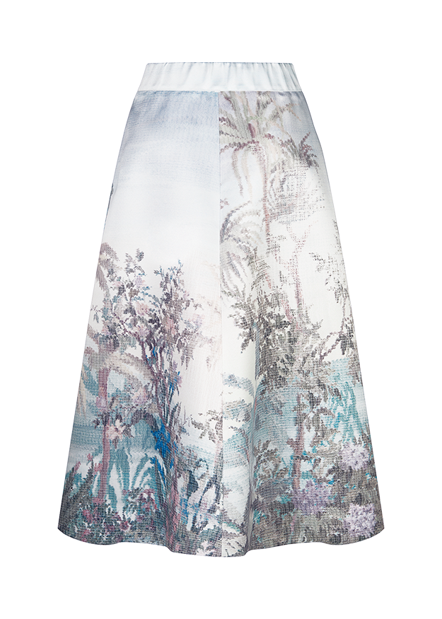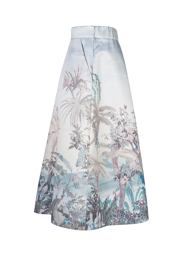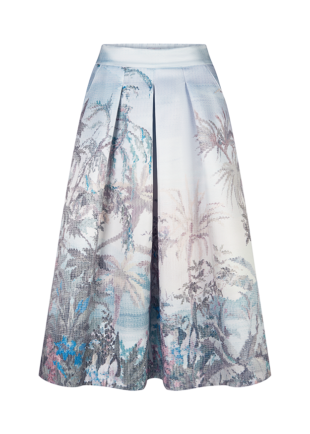 A fashion statement! Flared skirt, featuring an exclusive "Dal Lake Print" inspired by a lake in Kashmir, combines exotic flowers and mountains. The pleated waistband gives it a feminine touch, while the side pockets add a casual twist. Pair with a crop top for the perfect contrast.