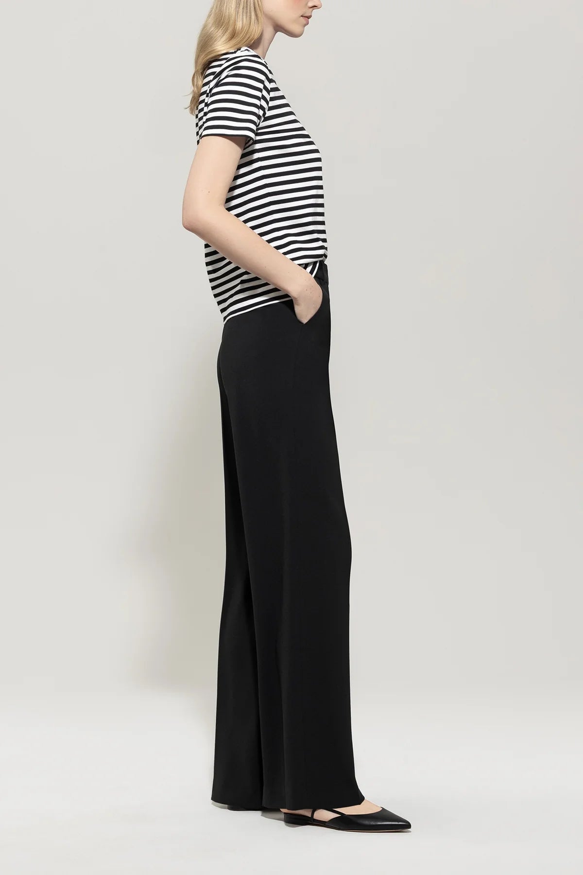 Wide-cut trousers made from flowing triacetate crêpe with a smooth satin interior. The classic design features belt loops, two side pockets and two indicated back pockets.