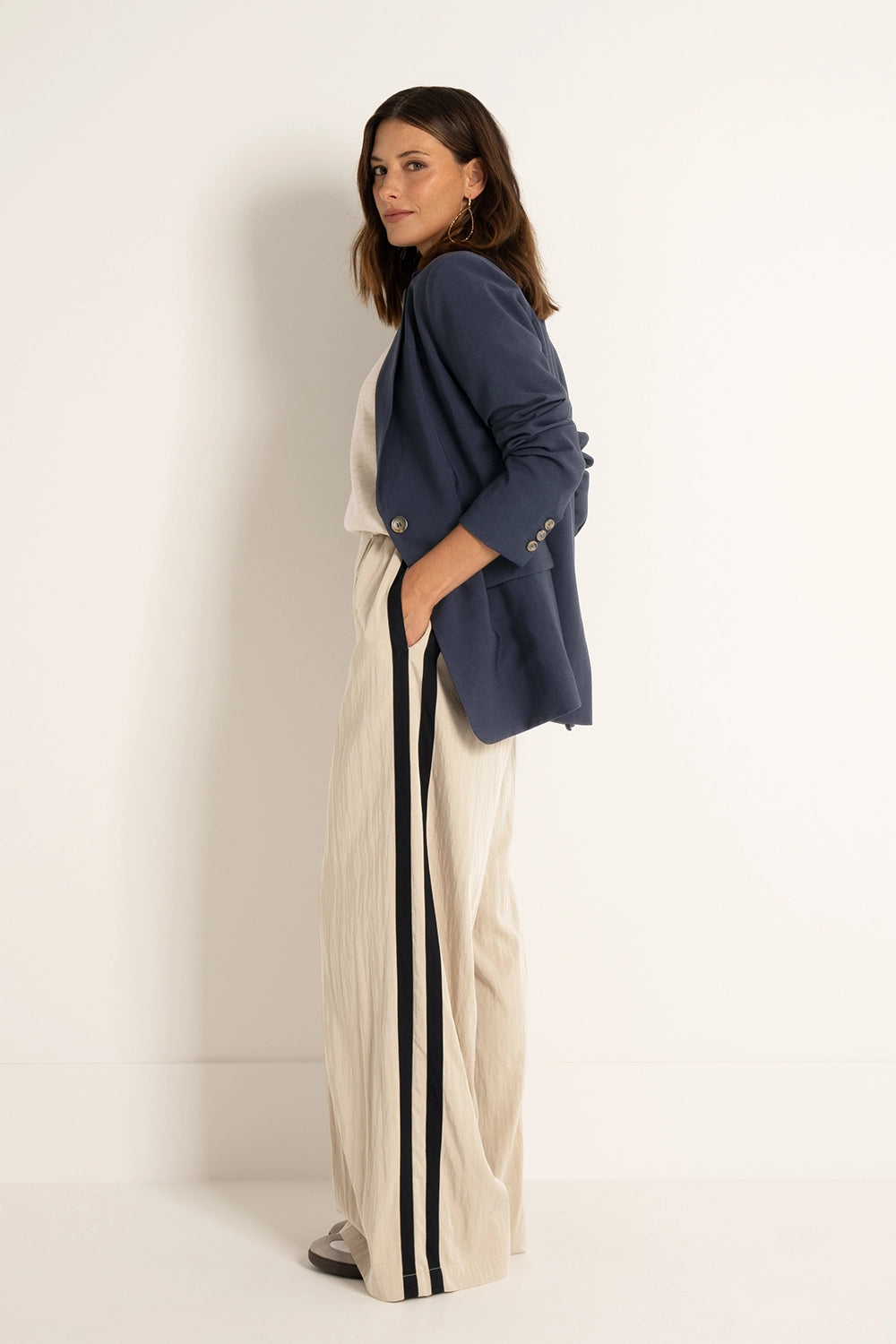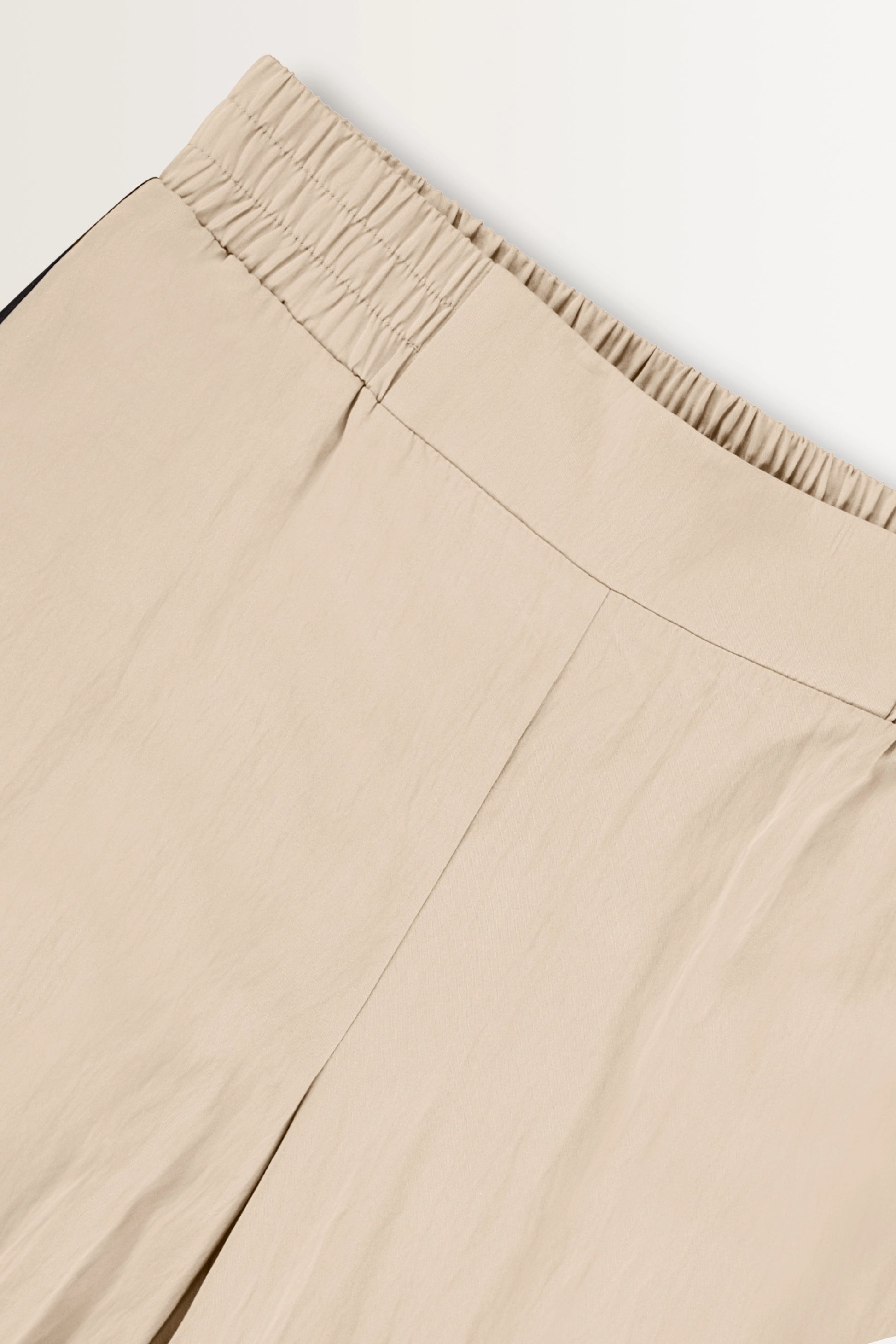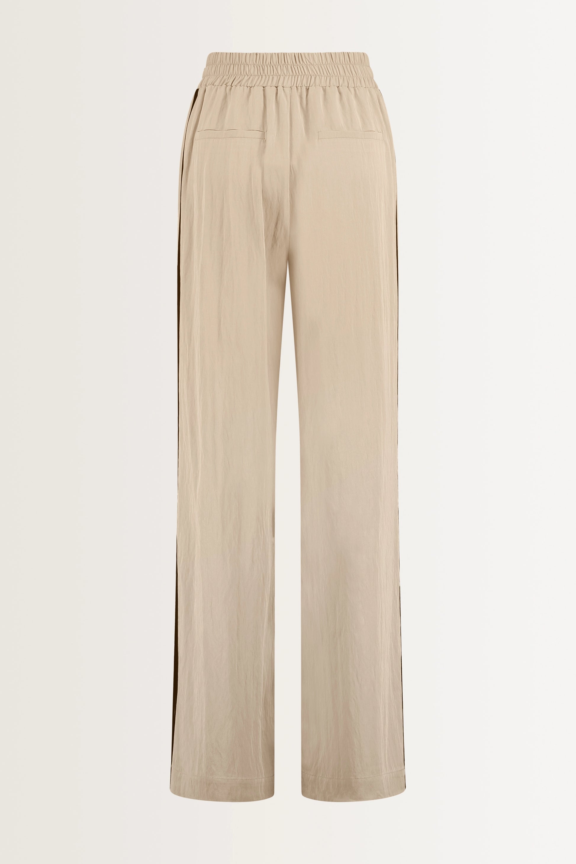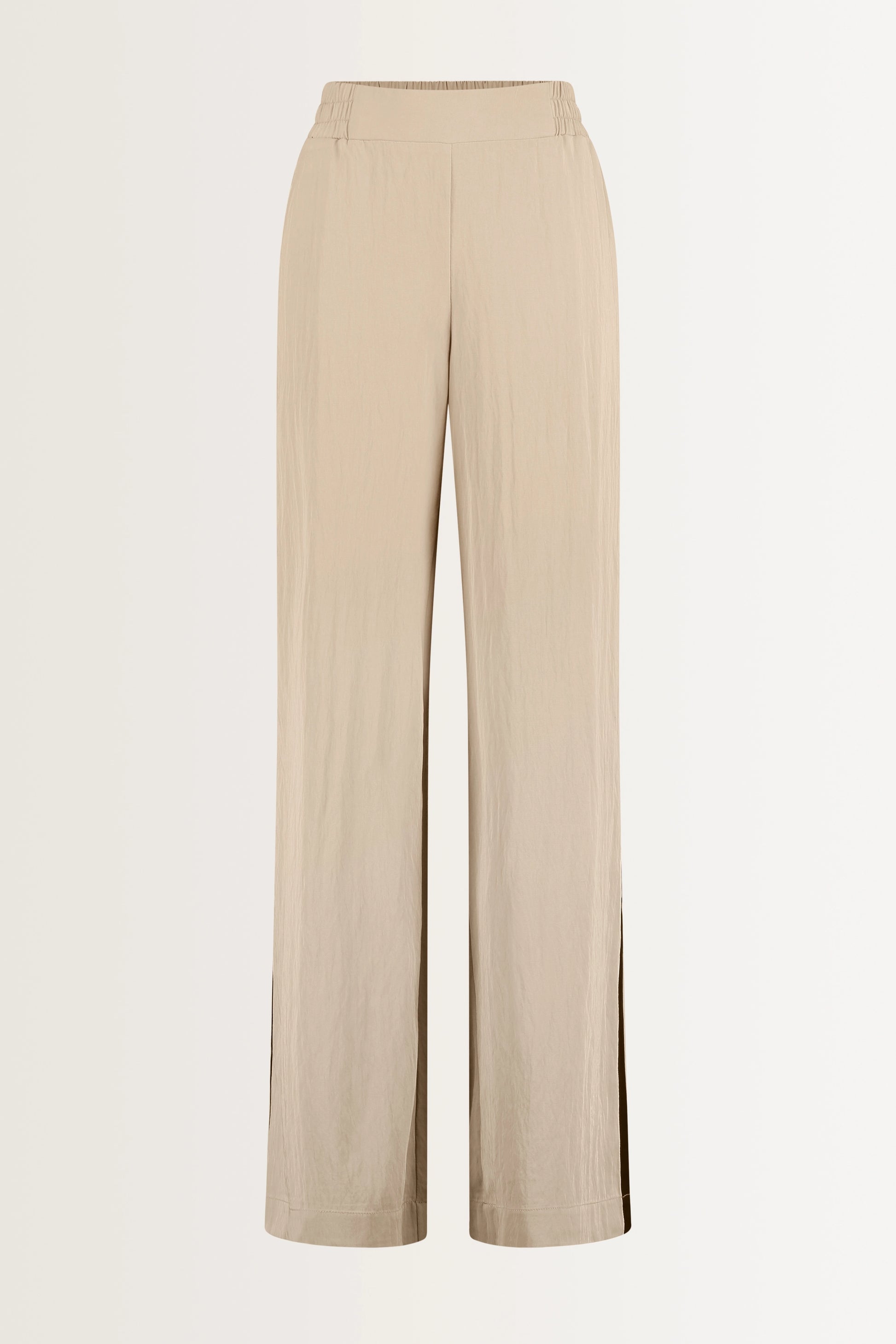 Taupe trousers with black side stripe – viscose blend. Straight, loose fit with elastic waistband. Lightweight and supple quality in a subtly shiny fabric. The black side panels provide a sporty and lengthening effect. Tip: wear with the matching top for a comfortable co-ord set with a stylish look.