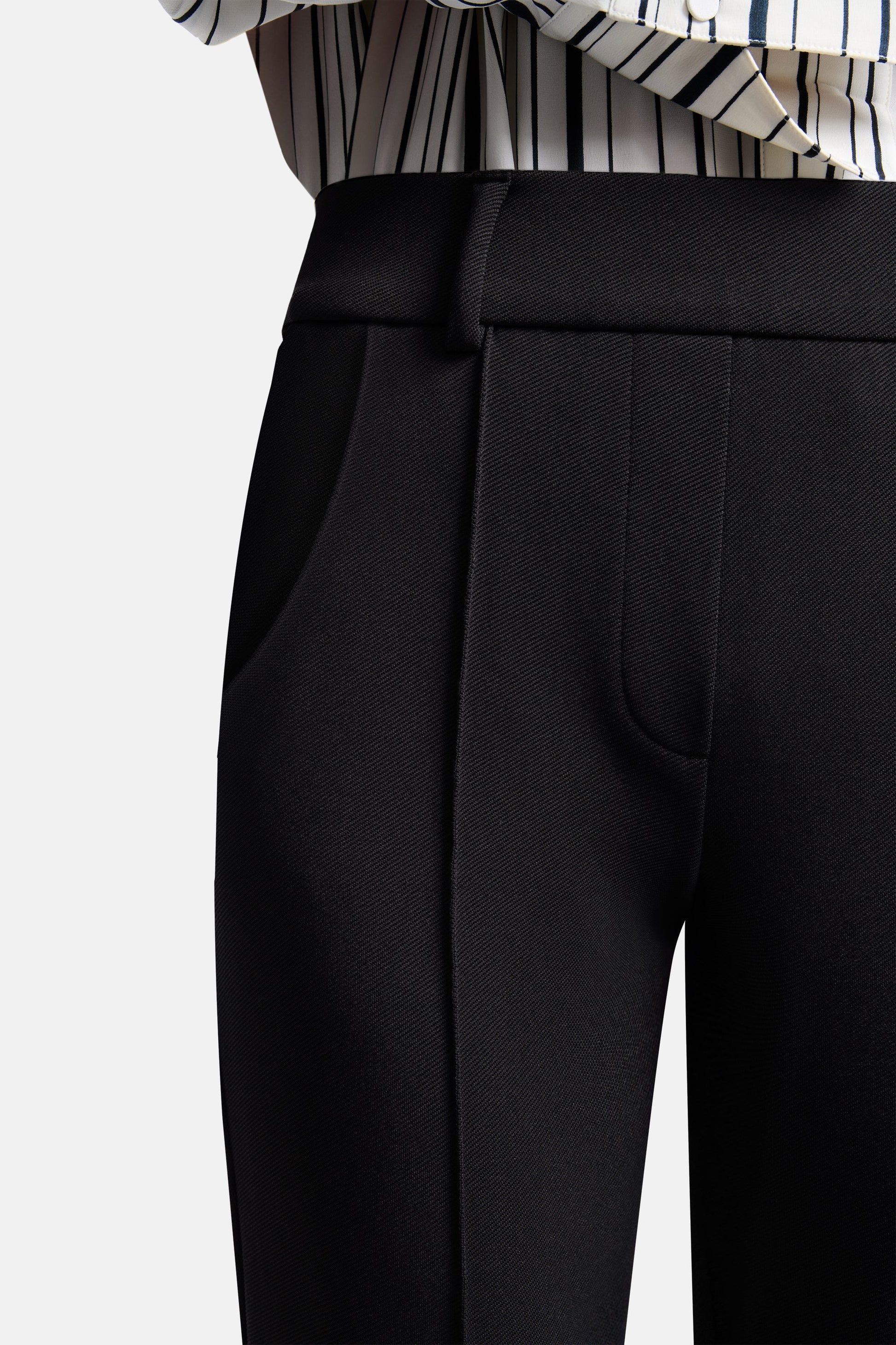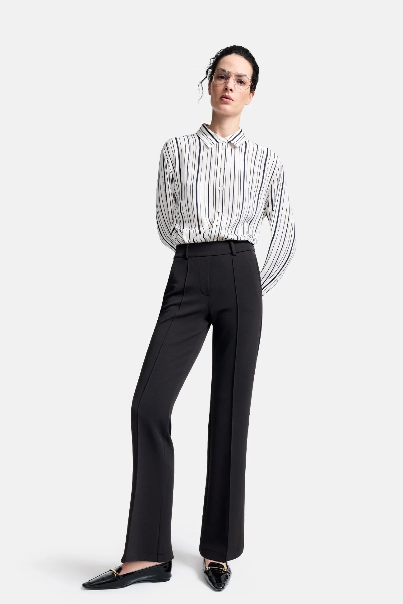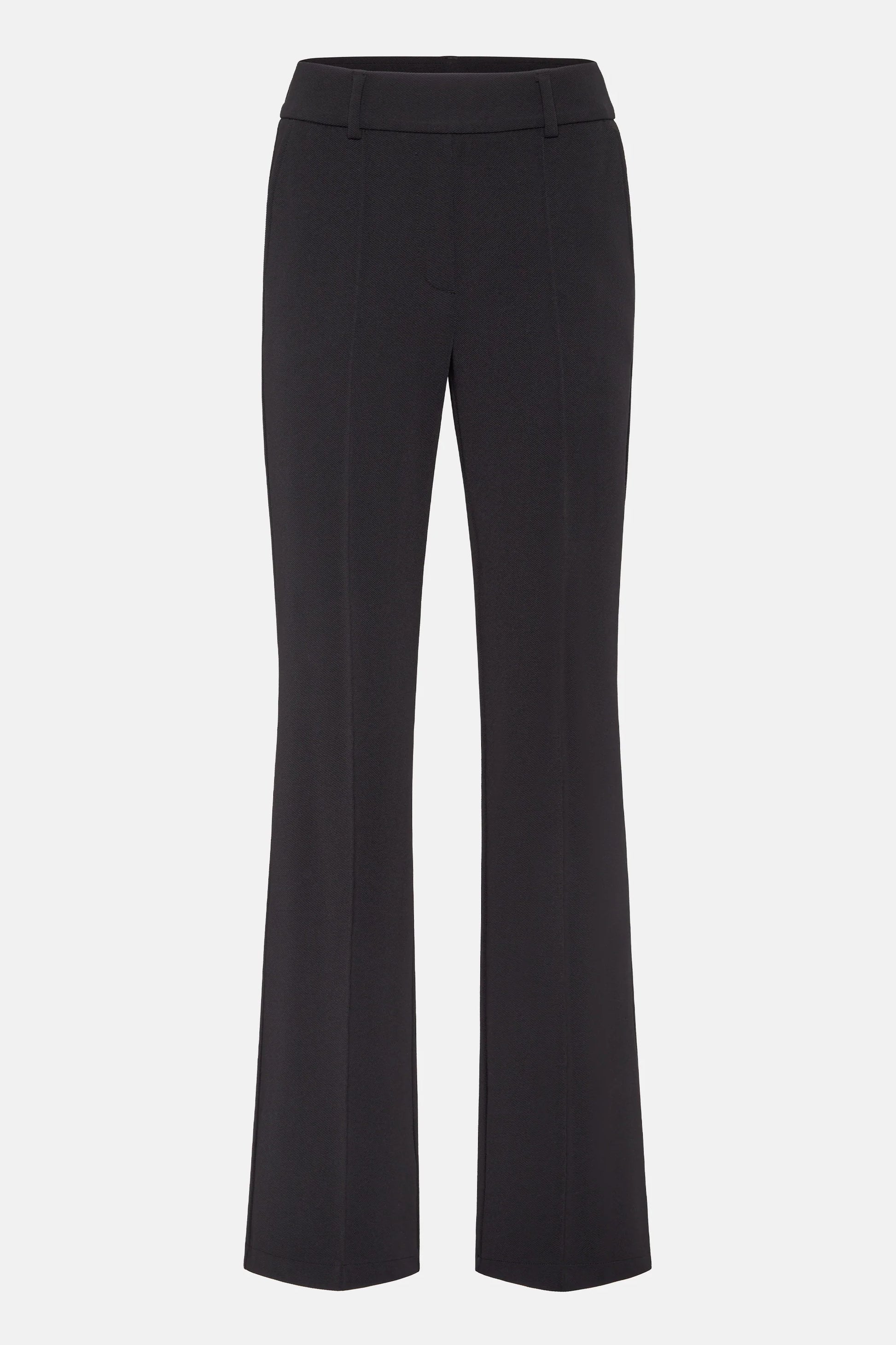 Flared trousers in Full Length. The trousers in Diagonal Structure Italian Techno Stretch fabric offer the perfect base for elegant, classy looks. Available in the color: Black.