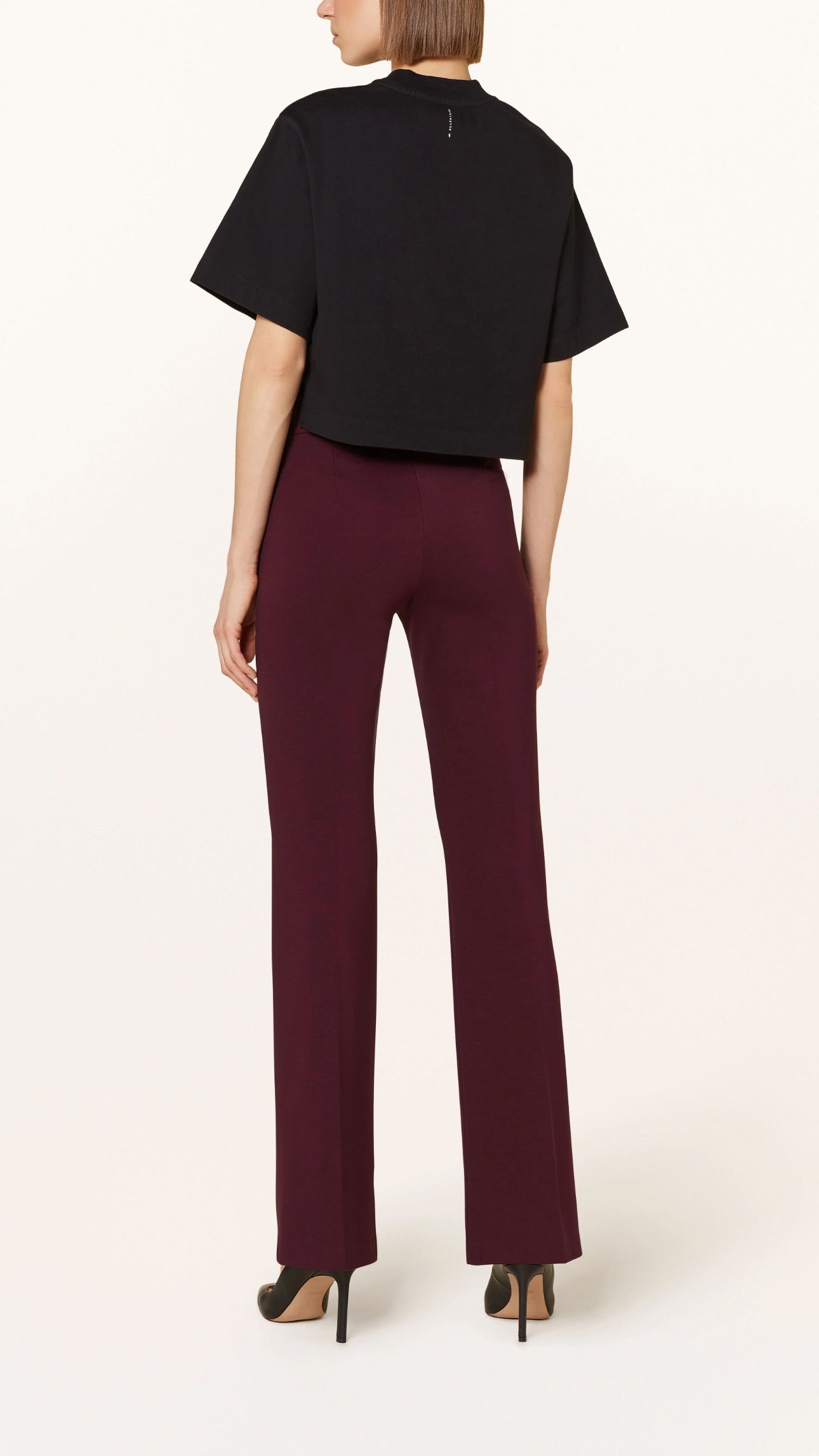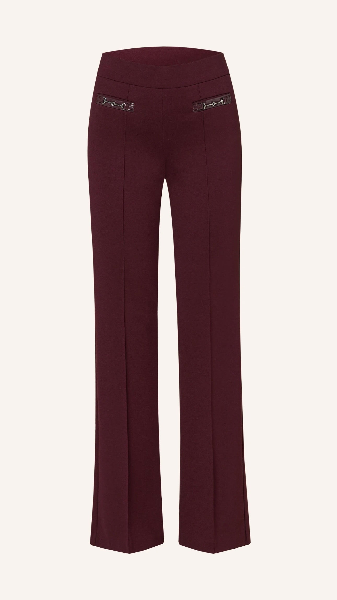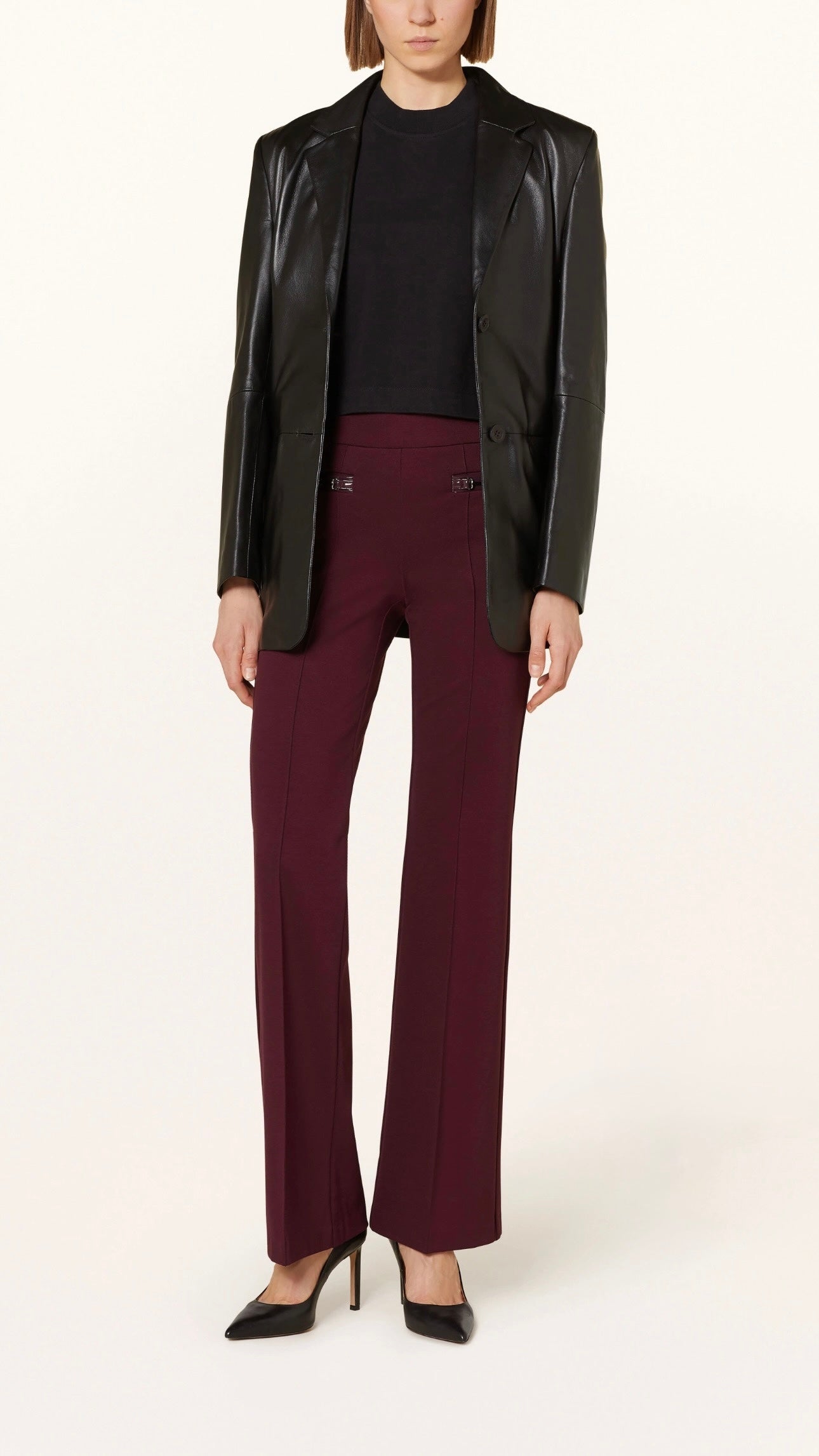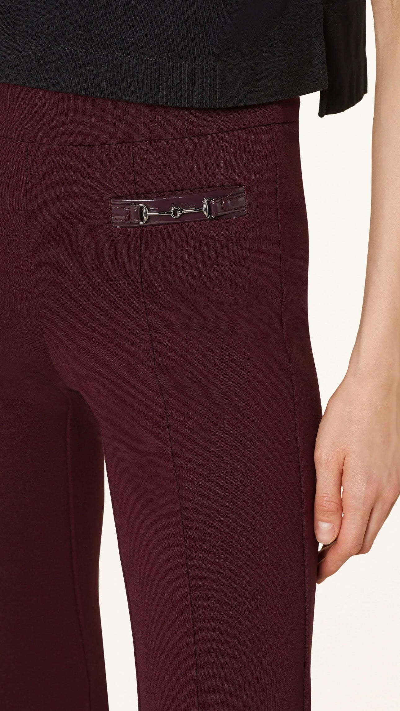 Trousers with a bridle detail with patent leather, made from Italian stretch fabric.
