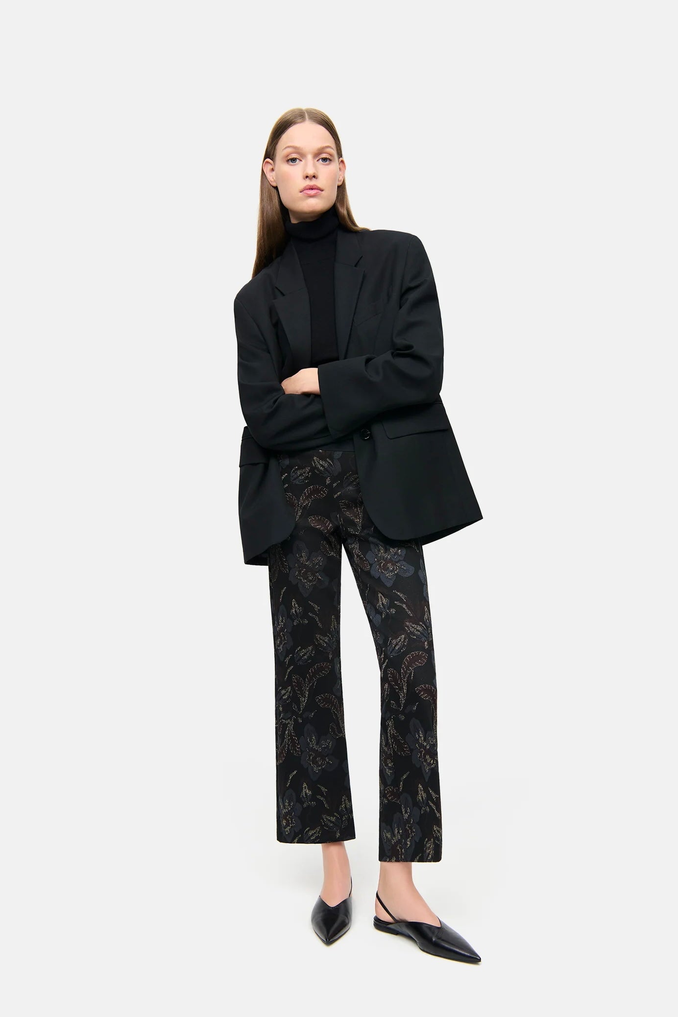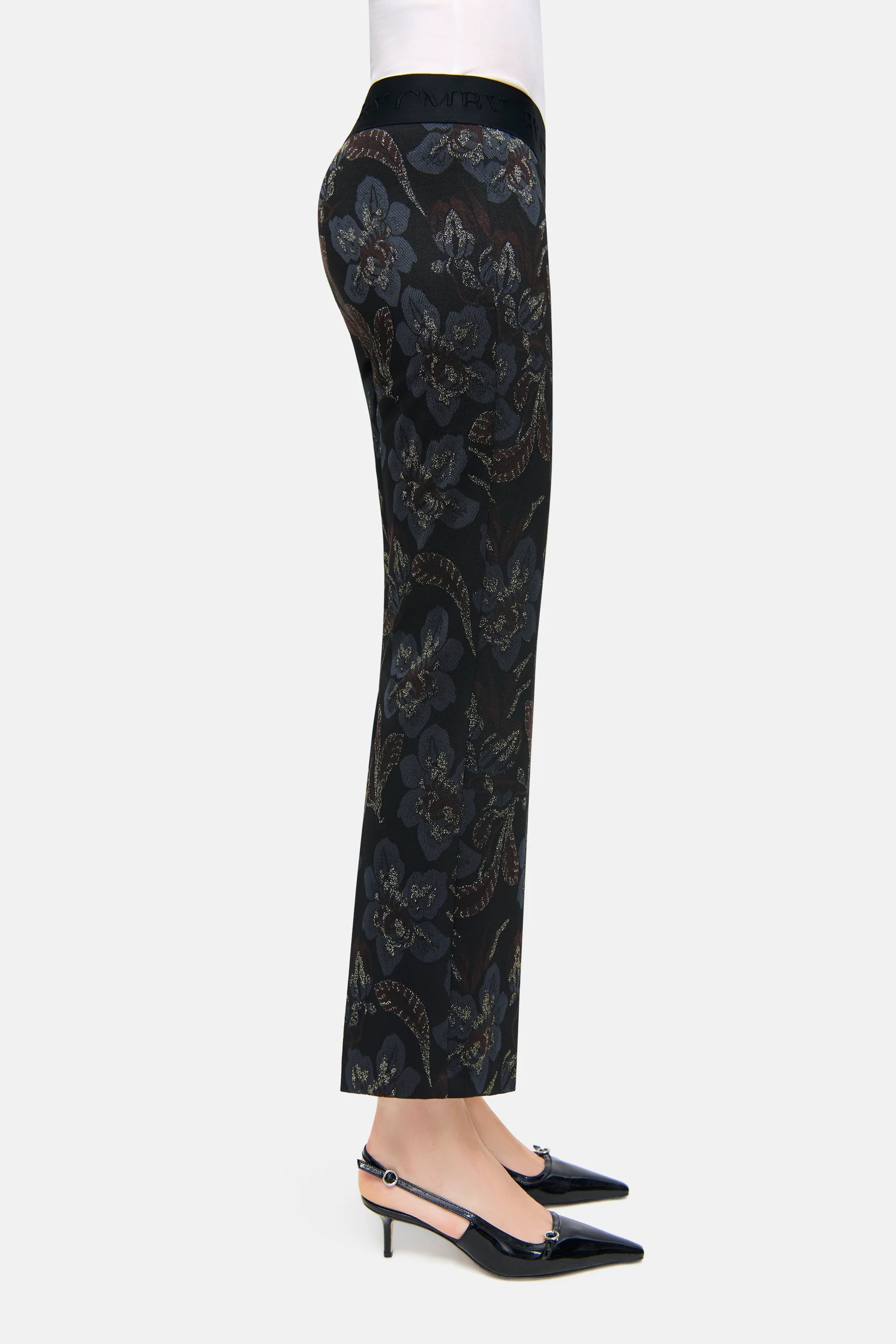 Flared trousers in a cropped length. These black trousers impress with their feminine flared silhouette and a special fabric: Flower Lurex Jersey Jacquard with an elegant floral pattern in muted shades of blue and brown, stylishly complemented by delicate gold accents. The comfortable waistband and elastane content ensure a pleasant fit and optimal freedom of movement – perfect for relaxed looks with a touch of elegance.