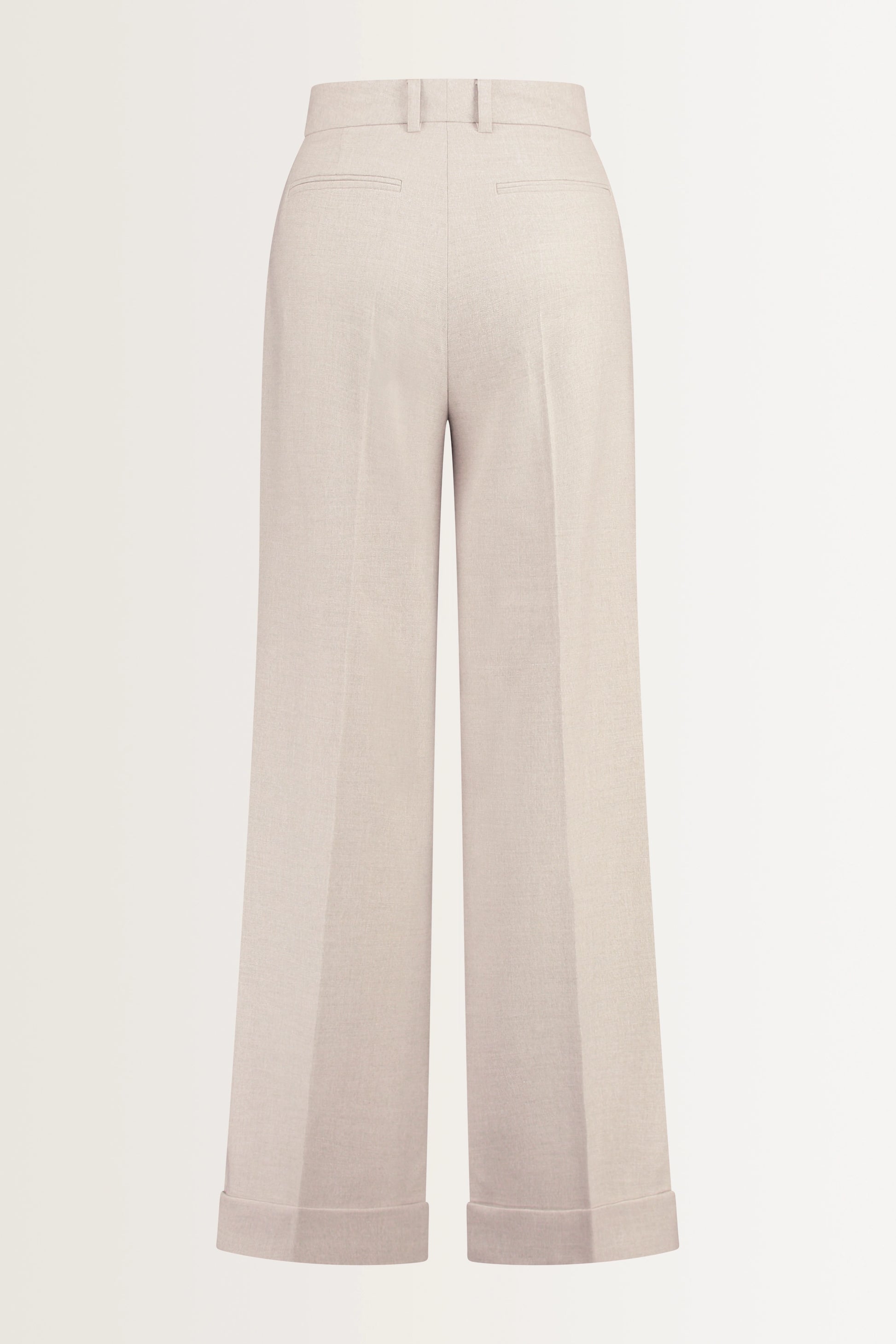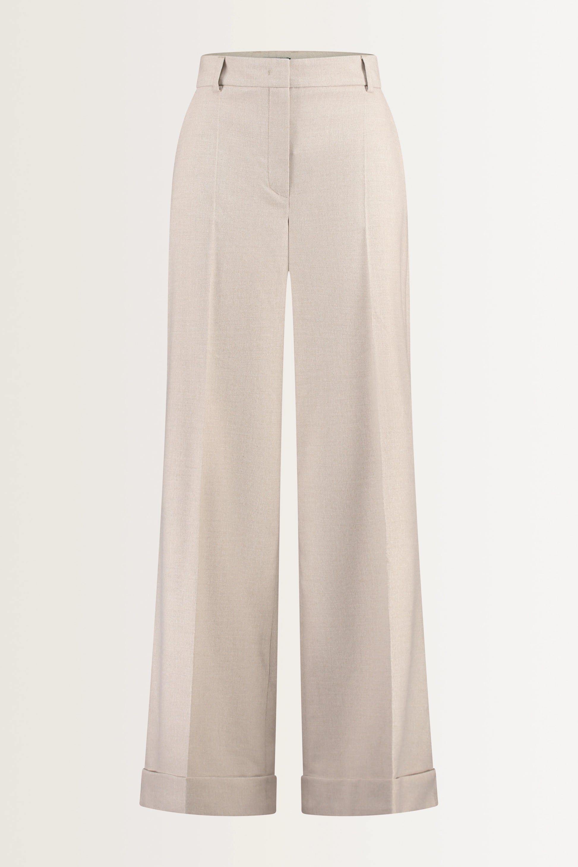 Flannel trousers in a taupe melange fabric – a stretch wool blend. Flared fit, straight leg with a turn-up hem, and a regular rise. The subtle flannel melange gives these trousers a rich, luxurious look. The turn-up hem adds a fashionable twist and emphasizes the elegant, relaxed look of the trousers. Perfect for both business and casual wear: pair with a soft knit or a tailored jacket for the perfect autumn look.