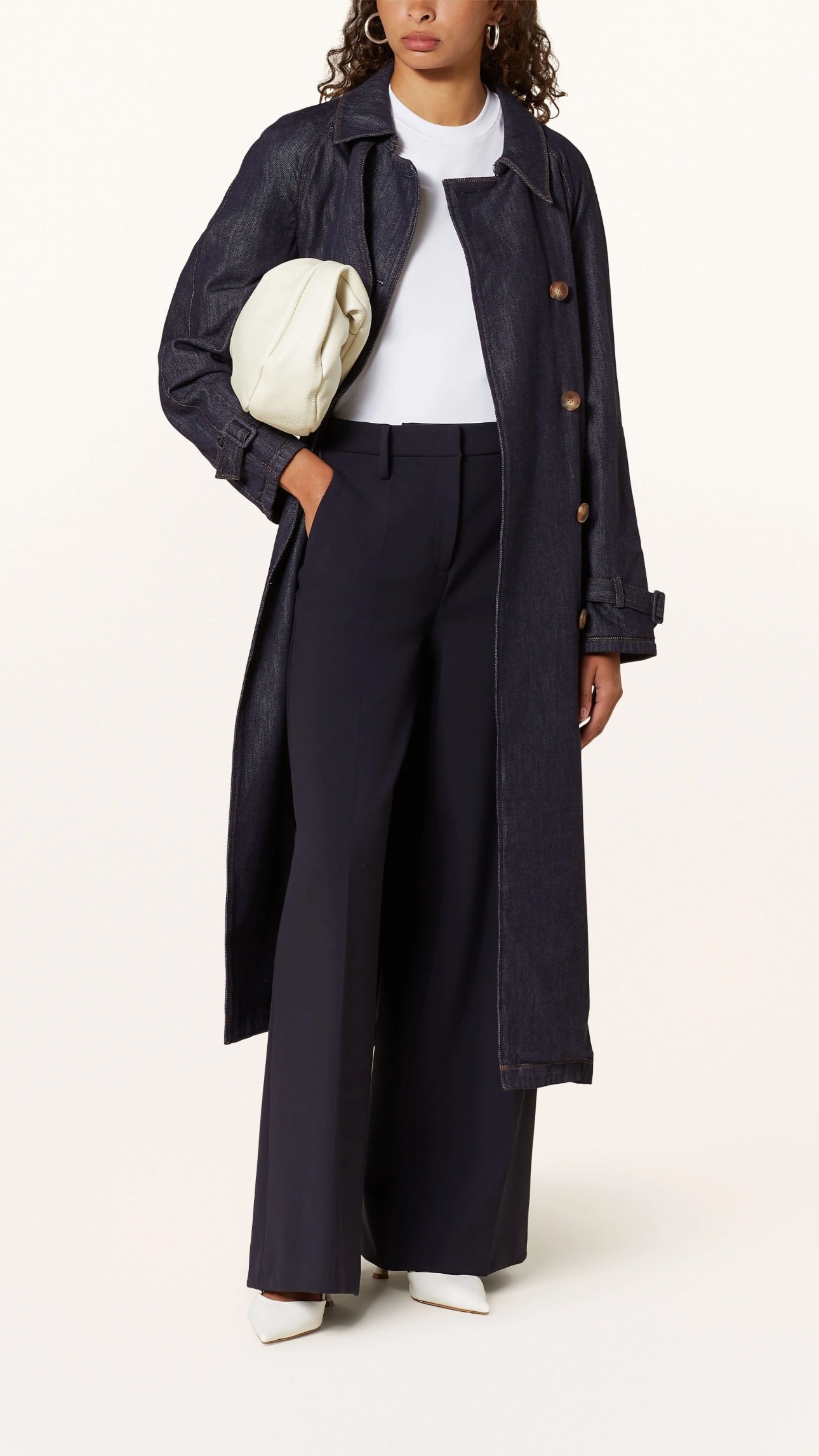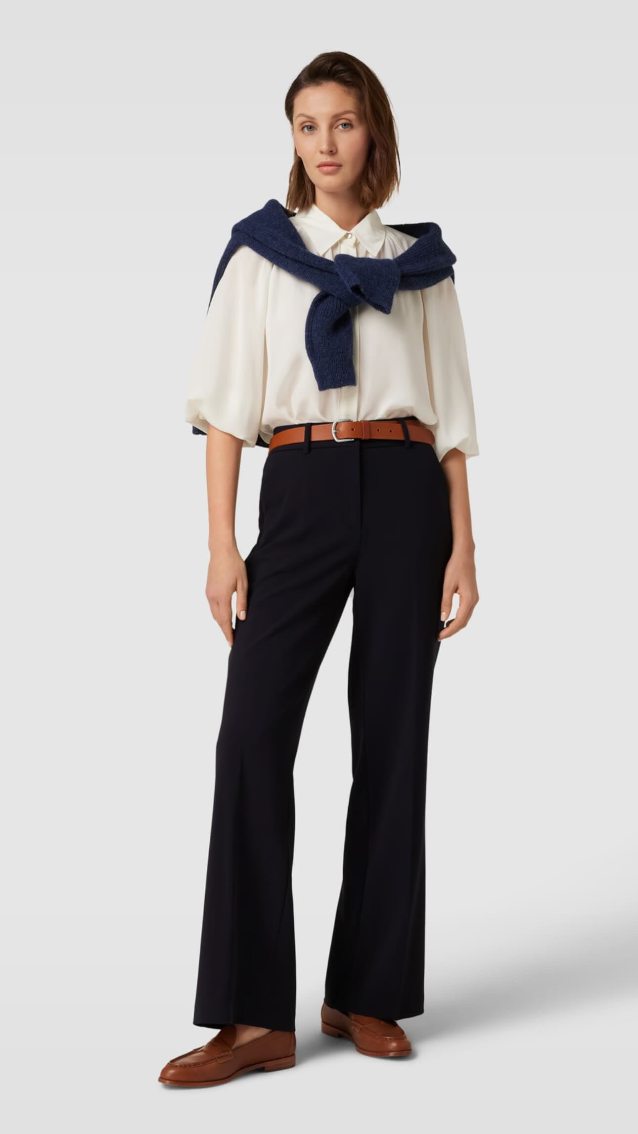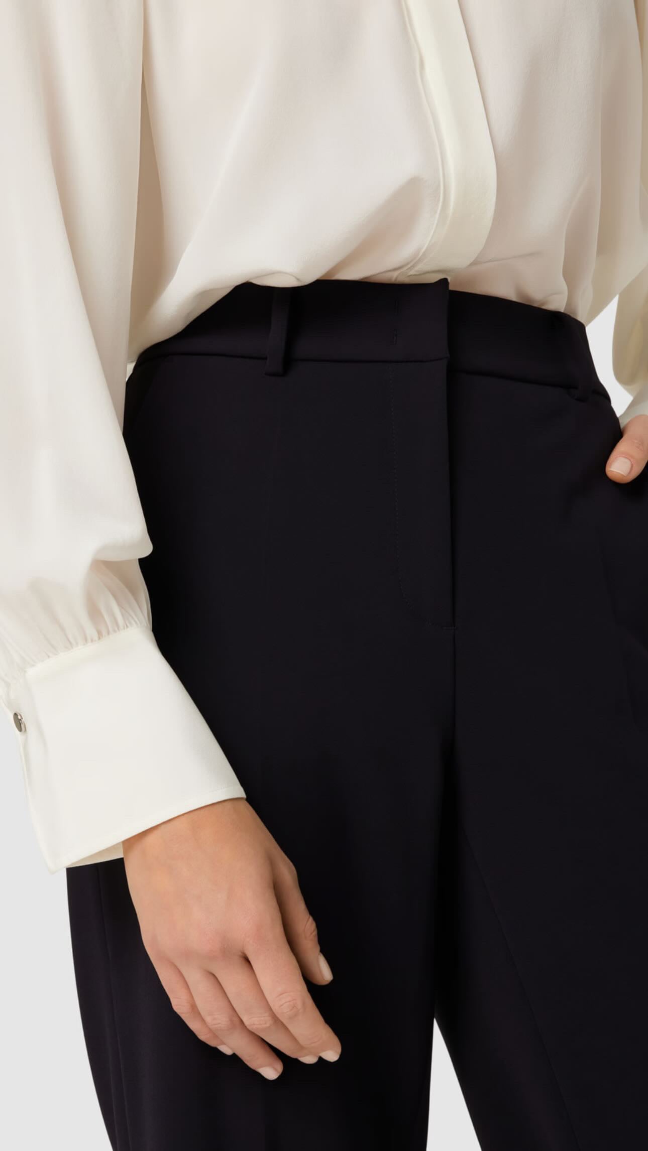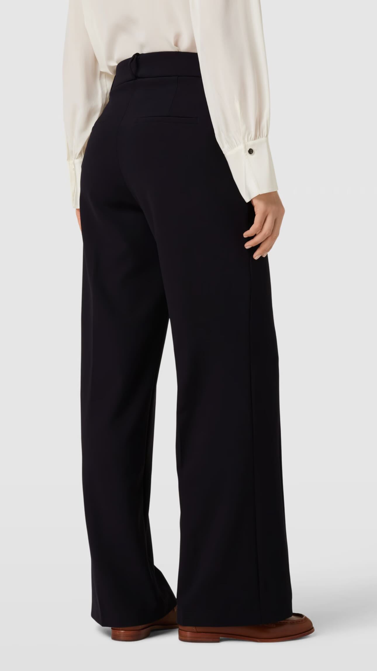 Elegant pair of trousers in navy color featuring high waist with belt loops and wide flared legs that give a sophisticated look. The trousers close with a button, hook and zip for a secure fit. Amelie has side pockets and welt back pockets. The firm, elastic fabric quality ensures comfort and freedom of movement throughout the day. Amelie is the perfect pair of trousers for a timeless and stylish wardrobe.