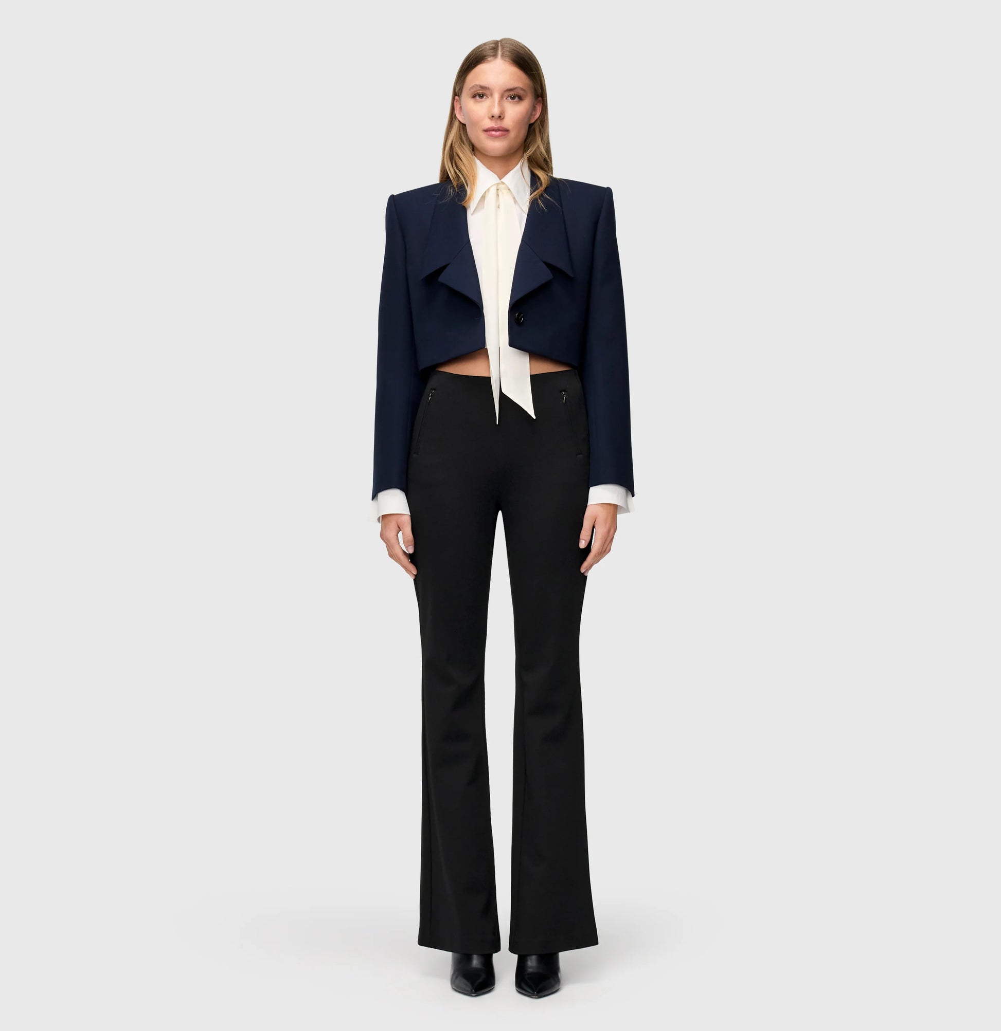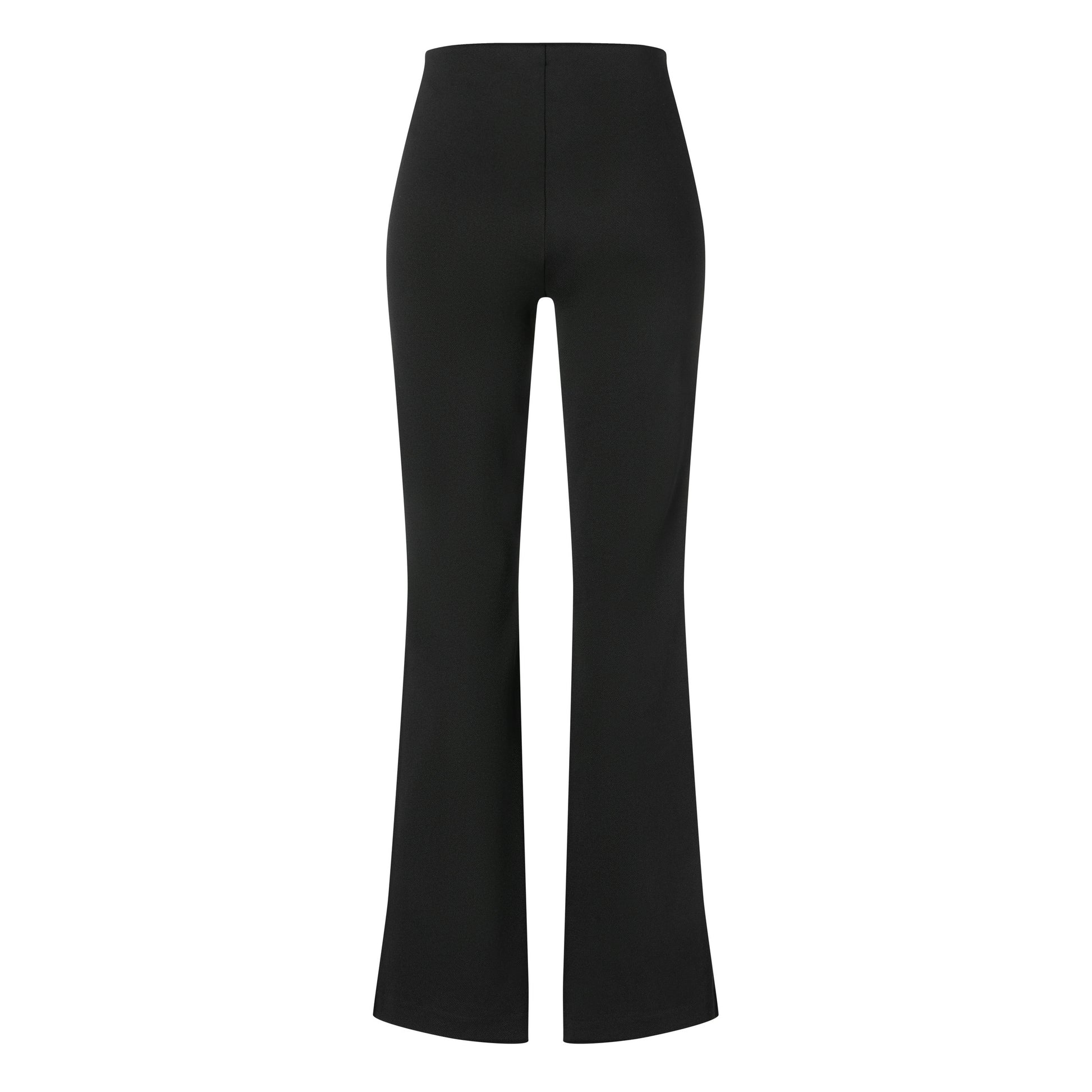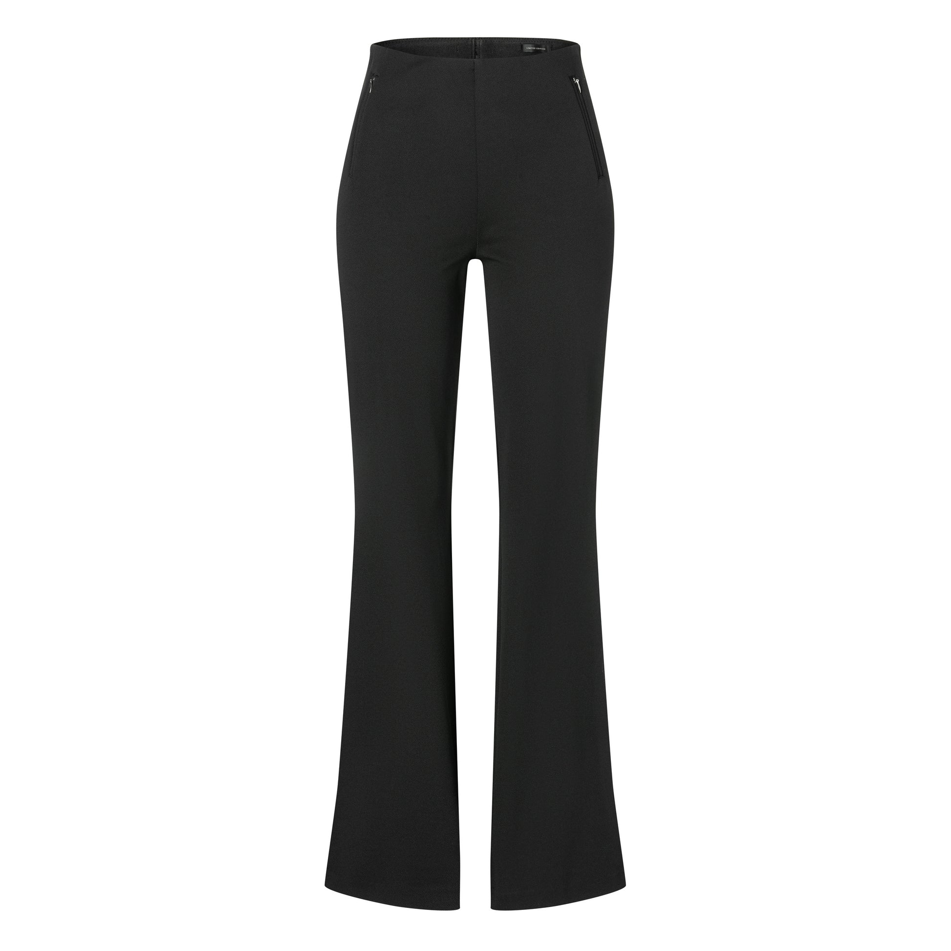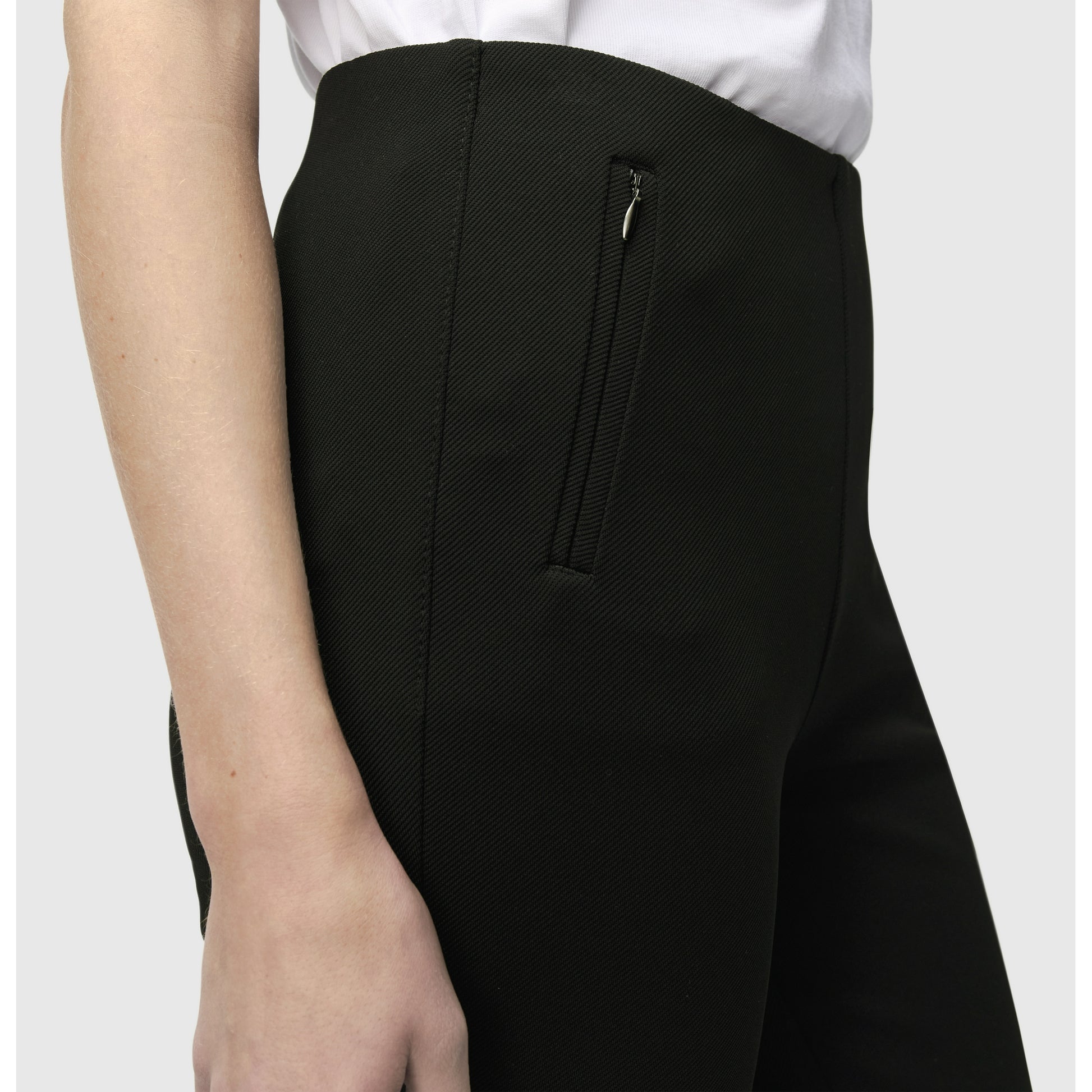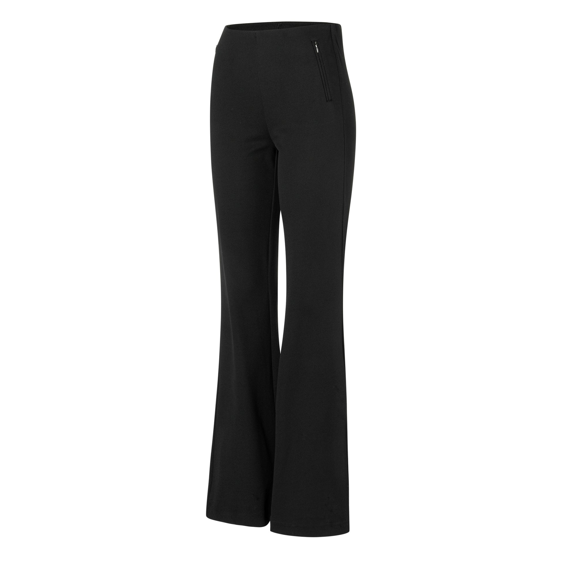 Fine stretch trousers with pockets on the front. The pockets have a zipper. The pants have elastic at the waist for a perfect fit