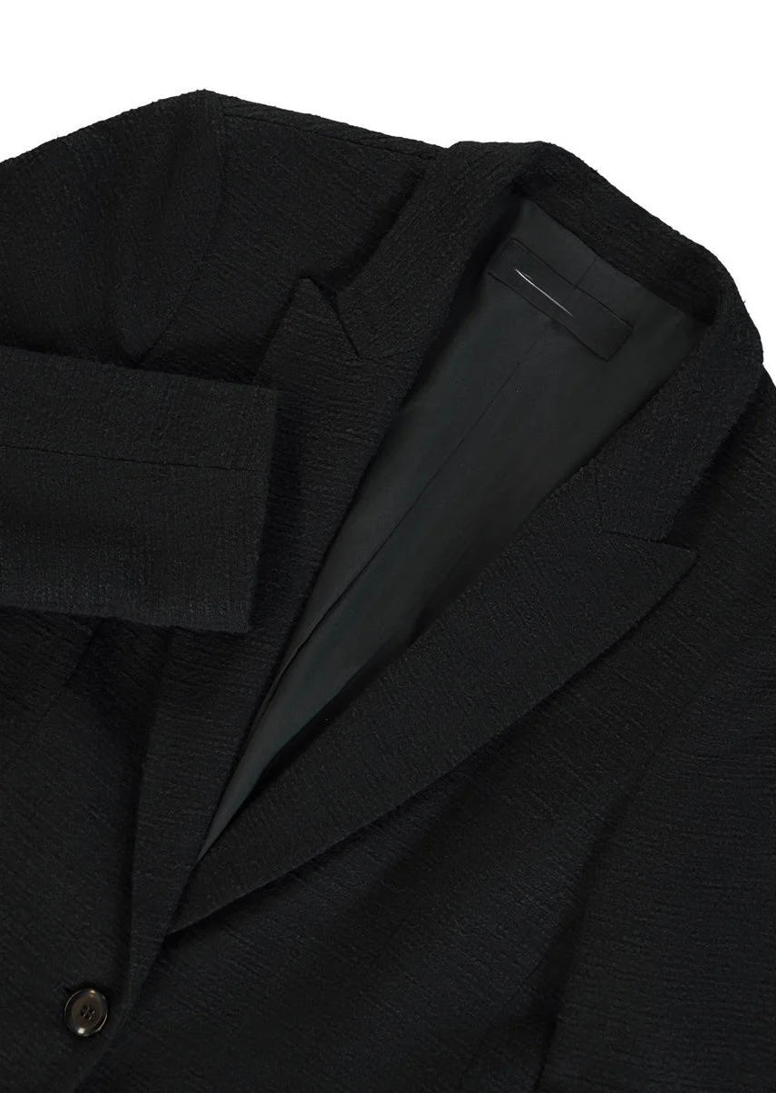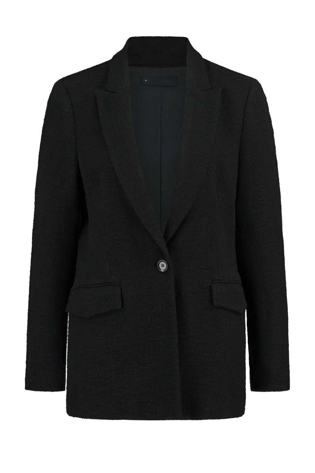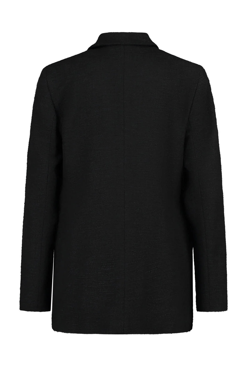 Black-colored blazer – cotton blend with a subtle structure. Timeless, slightly fitted and elegant, with classic lapels and a single button closure. The bouclé structure gives the blazer a sophisticated look, while the soft cotton blend ensures a comfortable fit. This versatile item effortlessly wears both casual and business and combines beautifully with pants.