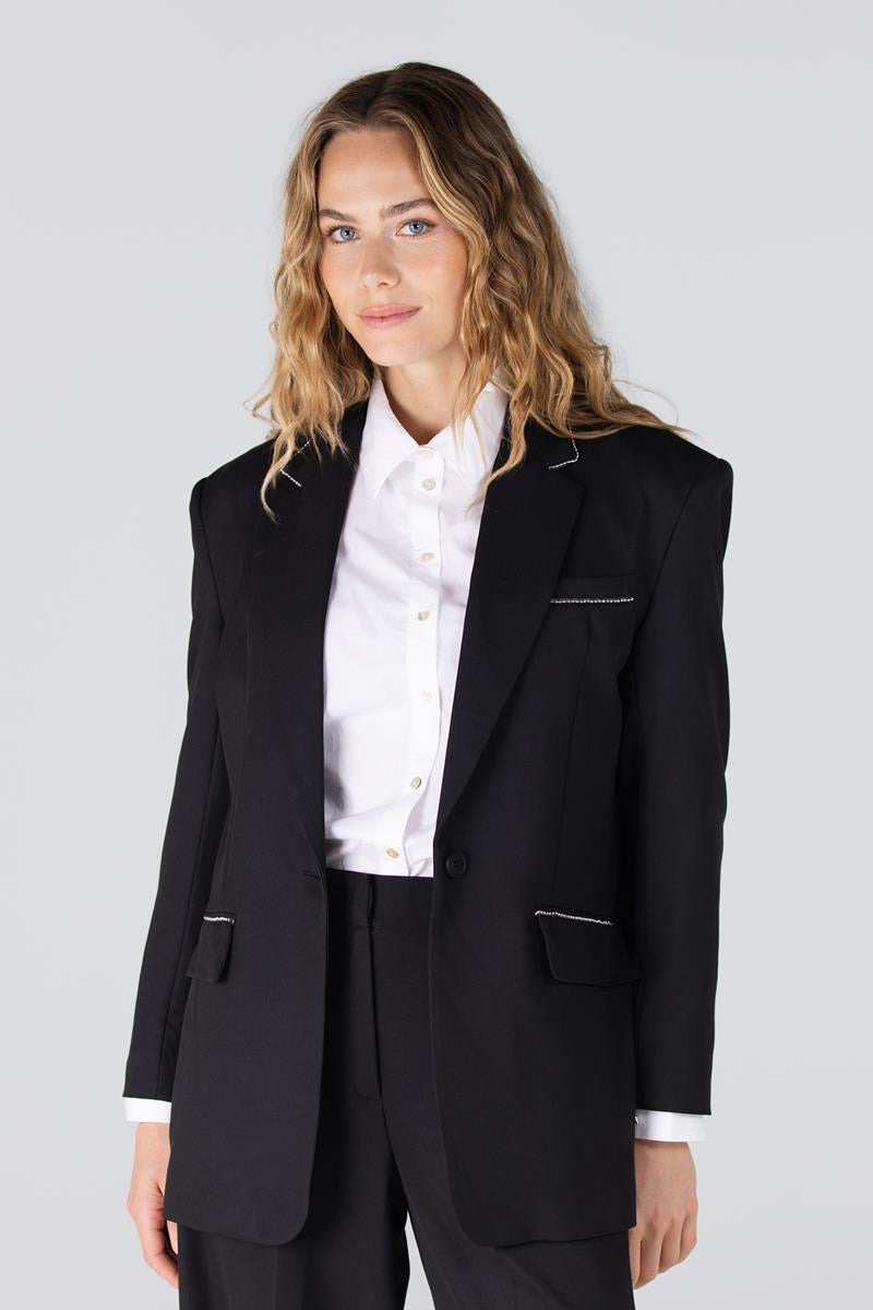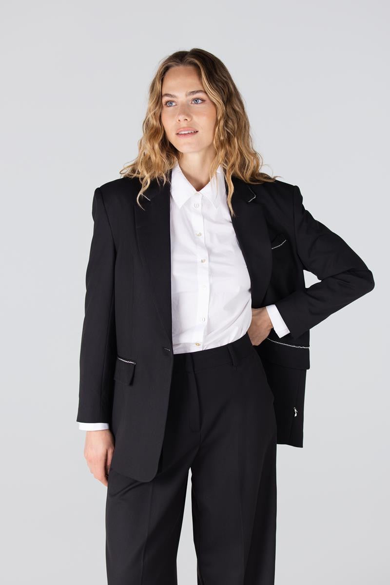 The Cassie blazer combines a classic look with striking details. This oversized black blazer is designed for a casual, powerful look. A decorative band runs along the lapel collar and pastel pockets, giving the blazer a unique, stylish finish.