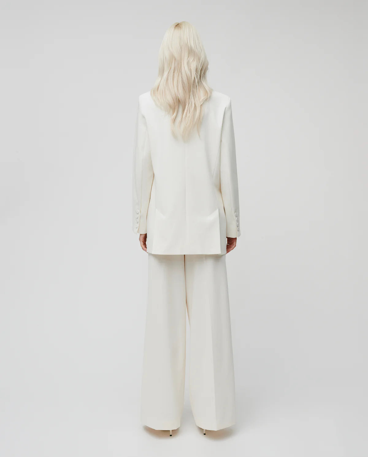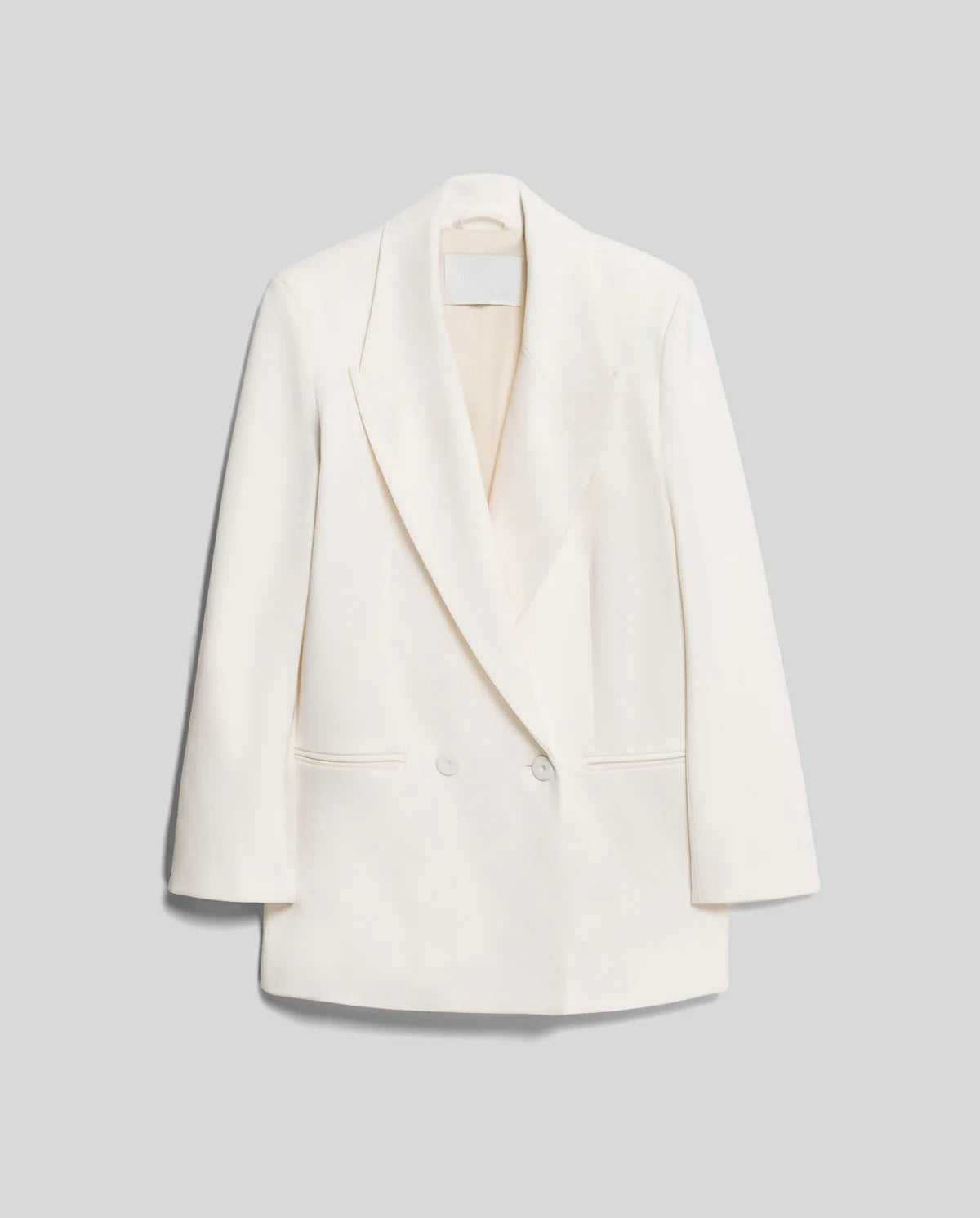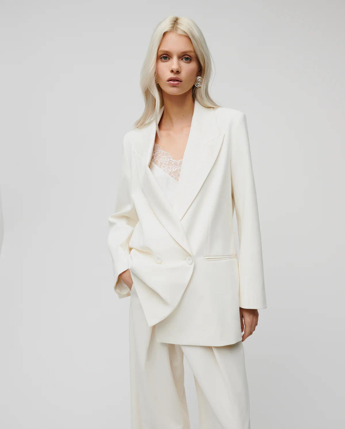 The Jenn blazer is a tuxedo blazer with a peak lapel. It is double breasted, straight fit, and can be combined very elegantly.