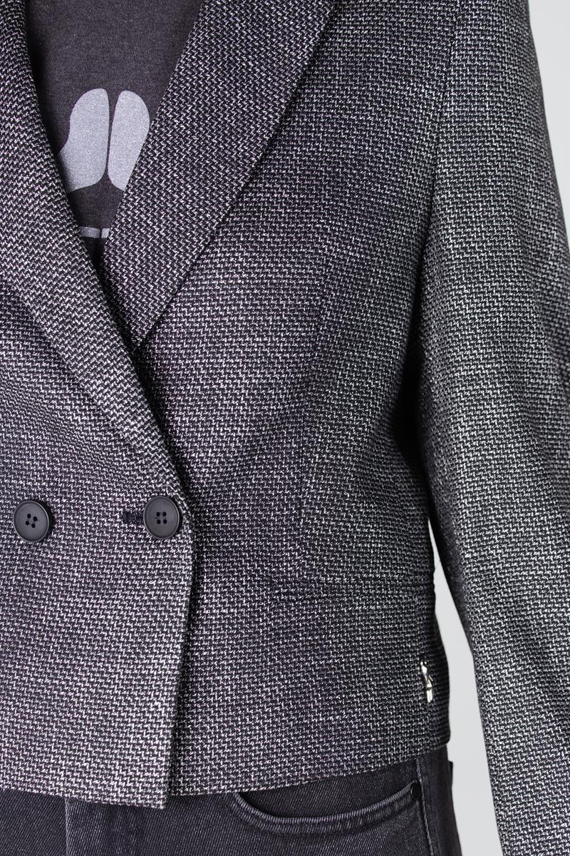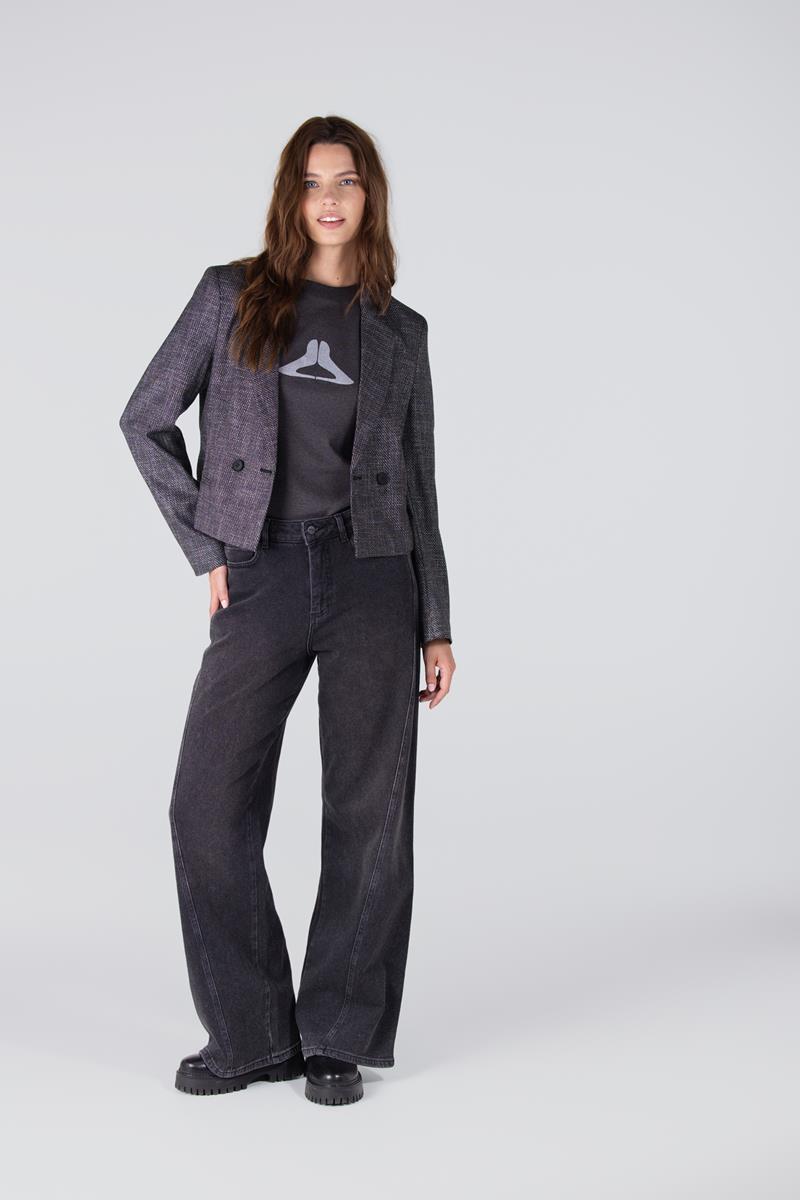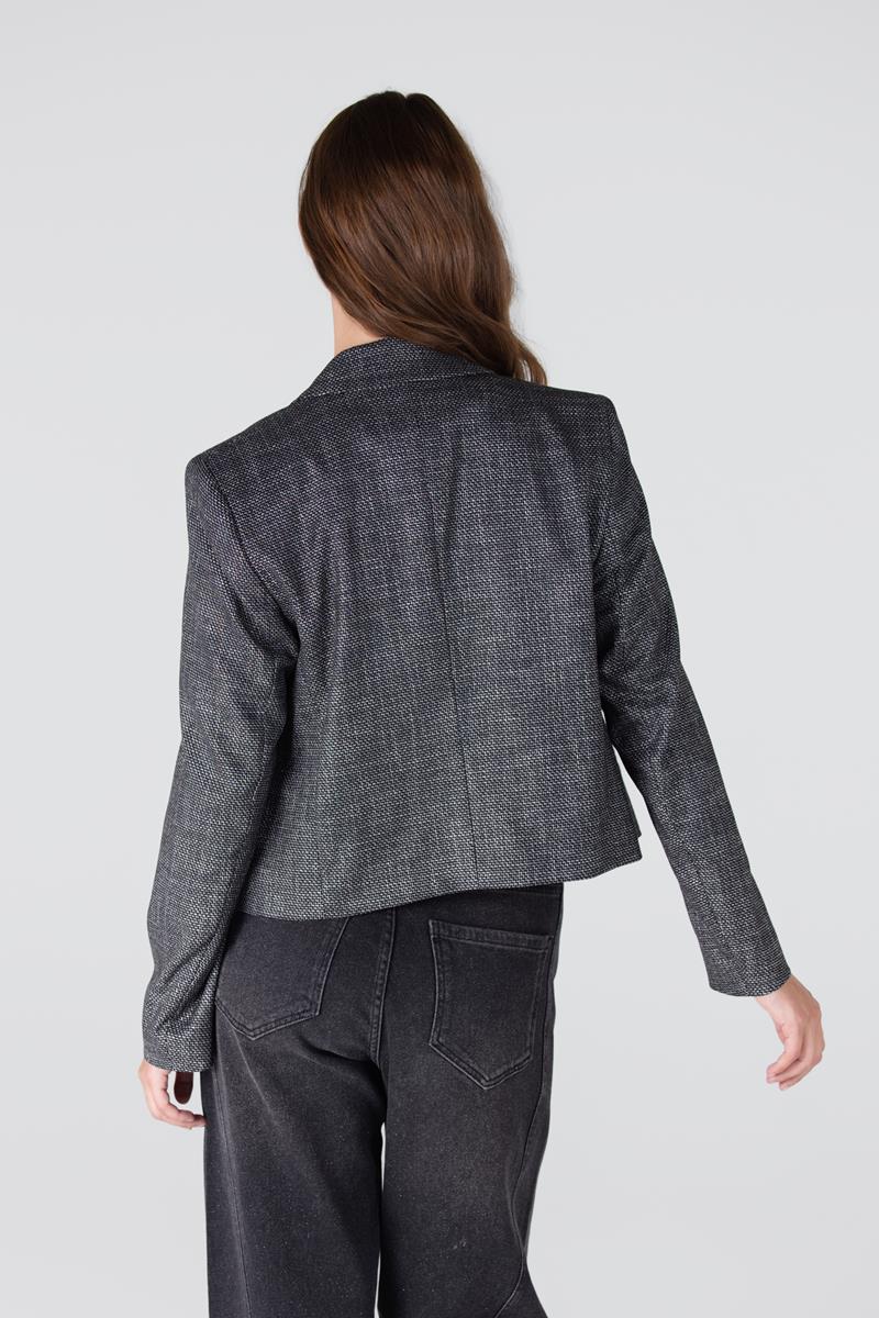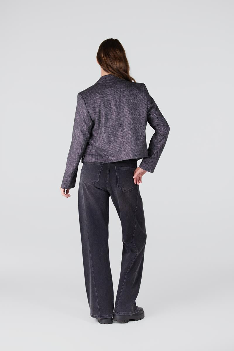 The Nia blazer is a short, tailored, double-breasted blazer with a lapel collar and refined welt pockets. The black buttons create a stylish contrast with the soft gray hue. Layer it over jeans for a casually chic look or with trousers for more sophisticated look