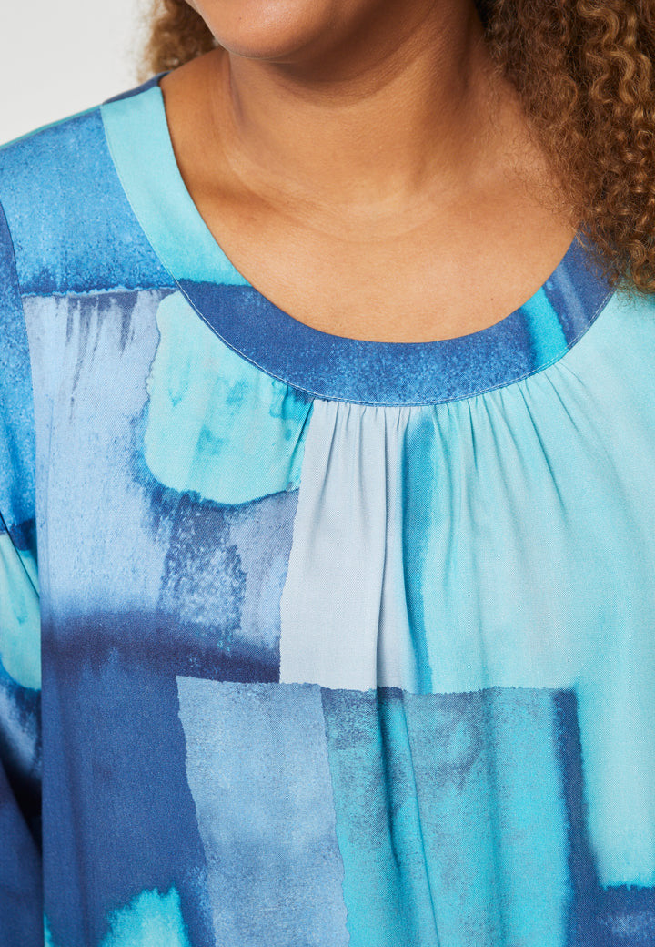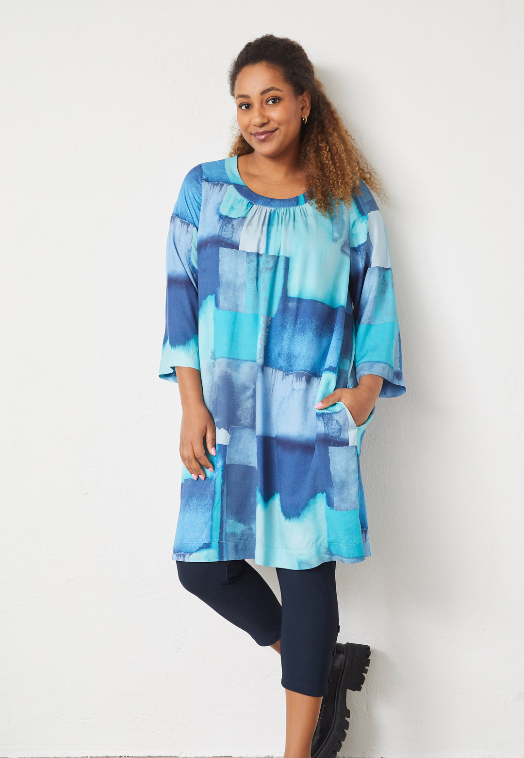A colourful and artistic tunic in a flattering A-shape – perfect if you want comfort without compromising on style. The soft viscose fabric drapes beautifully and feels smooth against the skin. It features a round neckline, three-quarter sleeves, and a slightly longer cut that makes it ideal for pairing with leggings or slim trousers.
