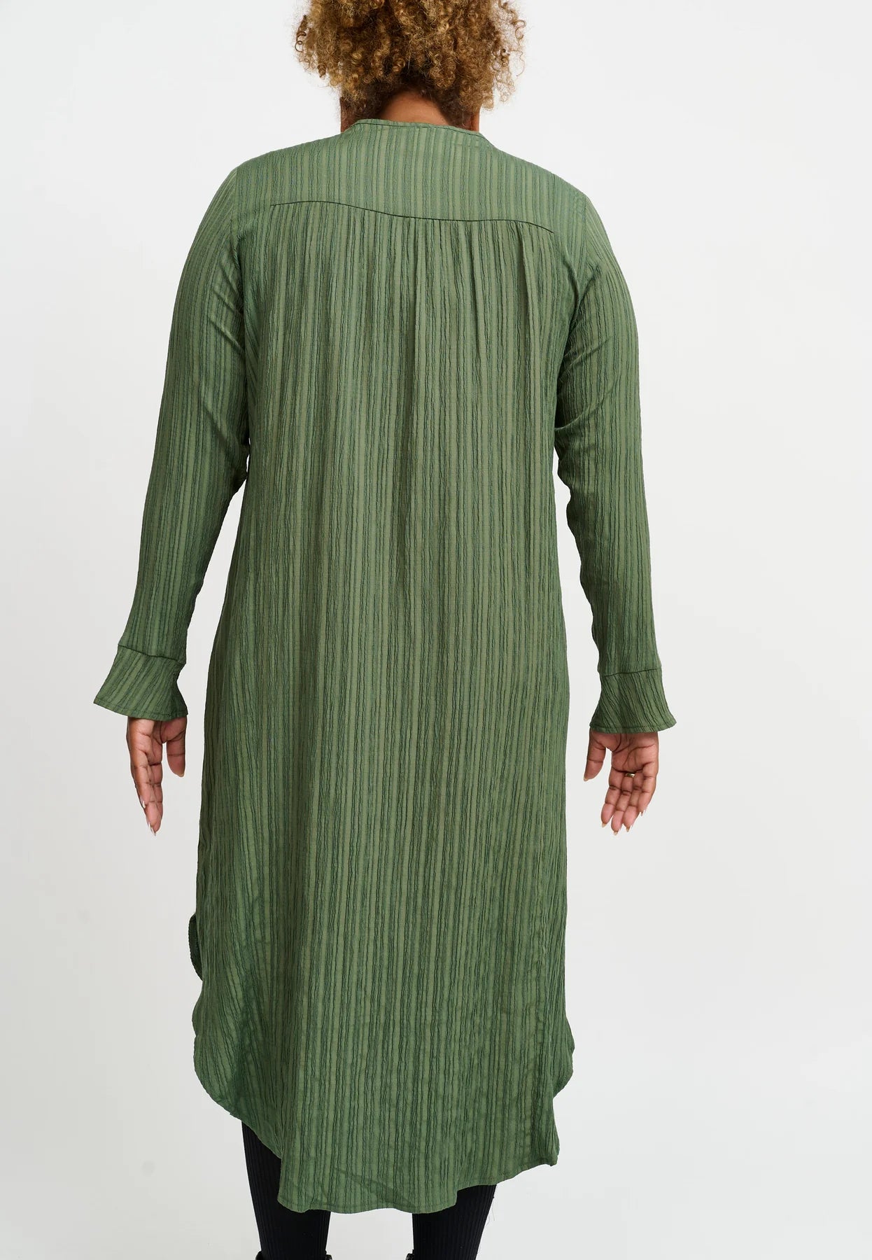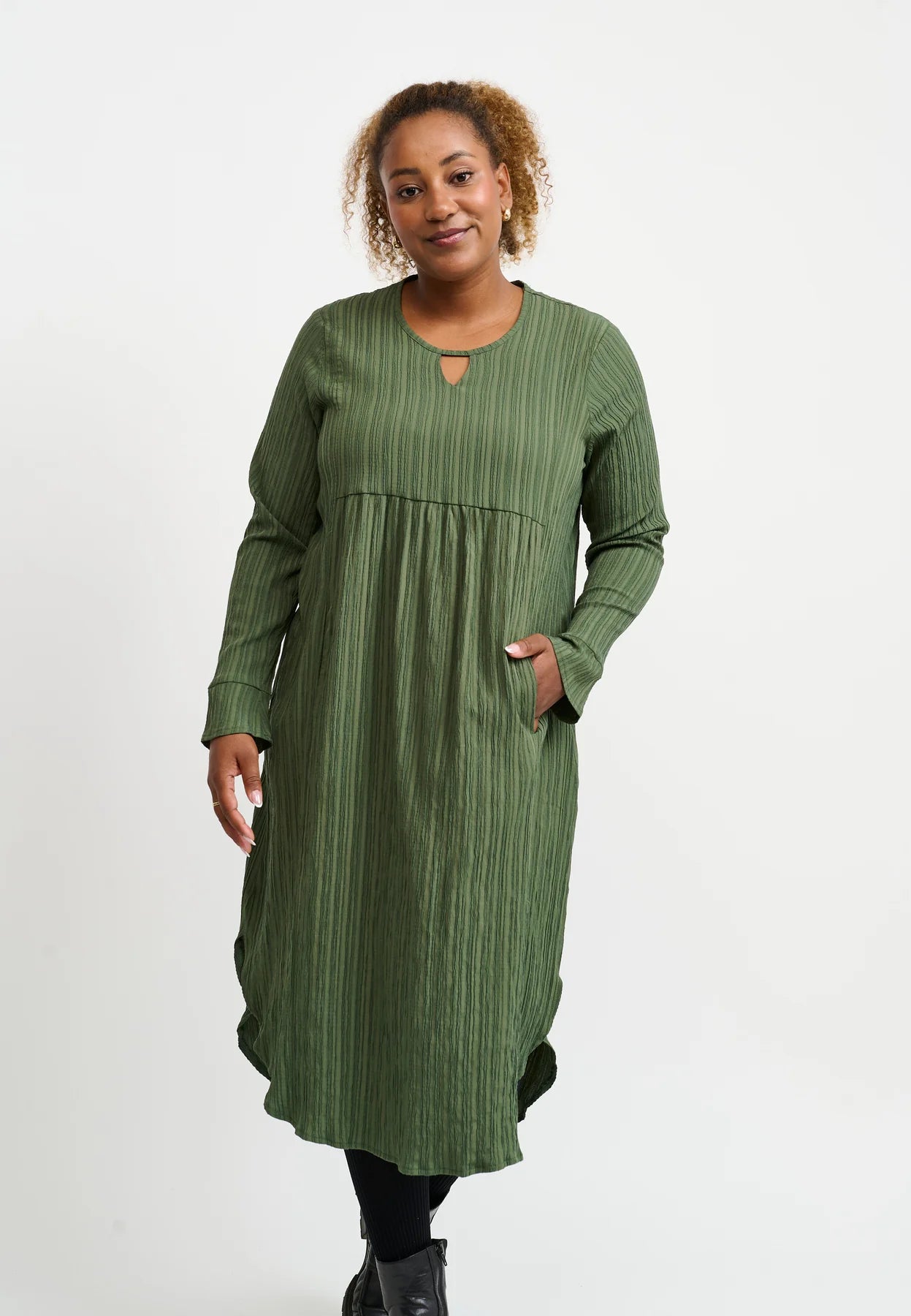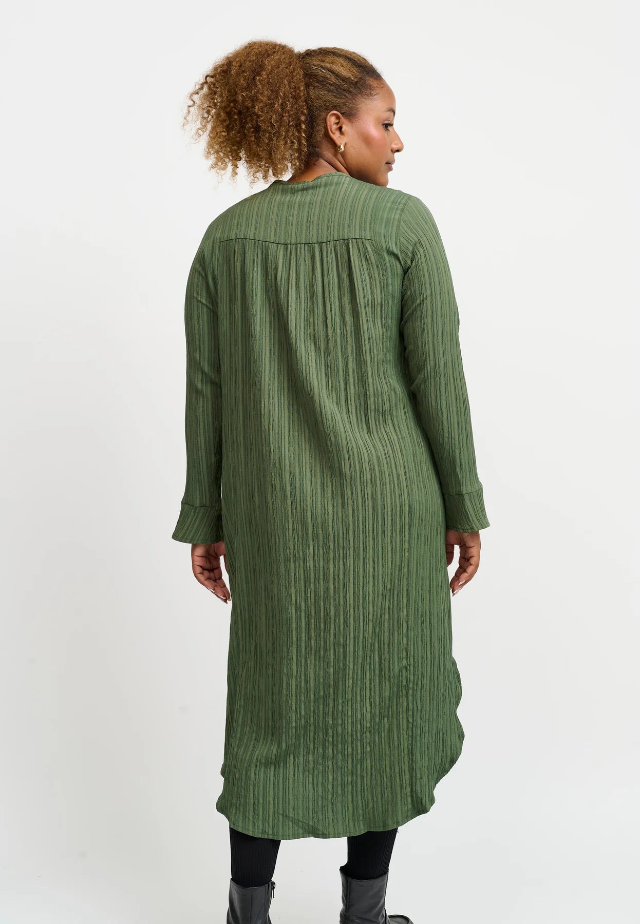 A long and elegant dress in a beautiful army green shade with an asymmetric hemline and relaxed details. The lightly textured fabric offers softness and stretch, while the generous A-line fit ensures comfort. It features long sleeves, a buttoned neckline, and side pockets for a casual yet refined look.