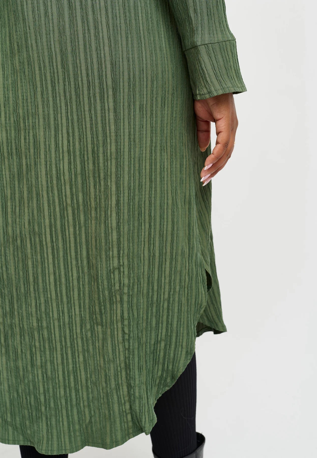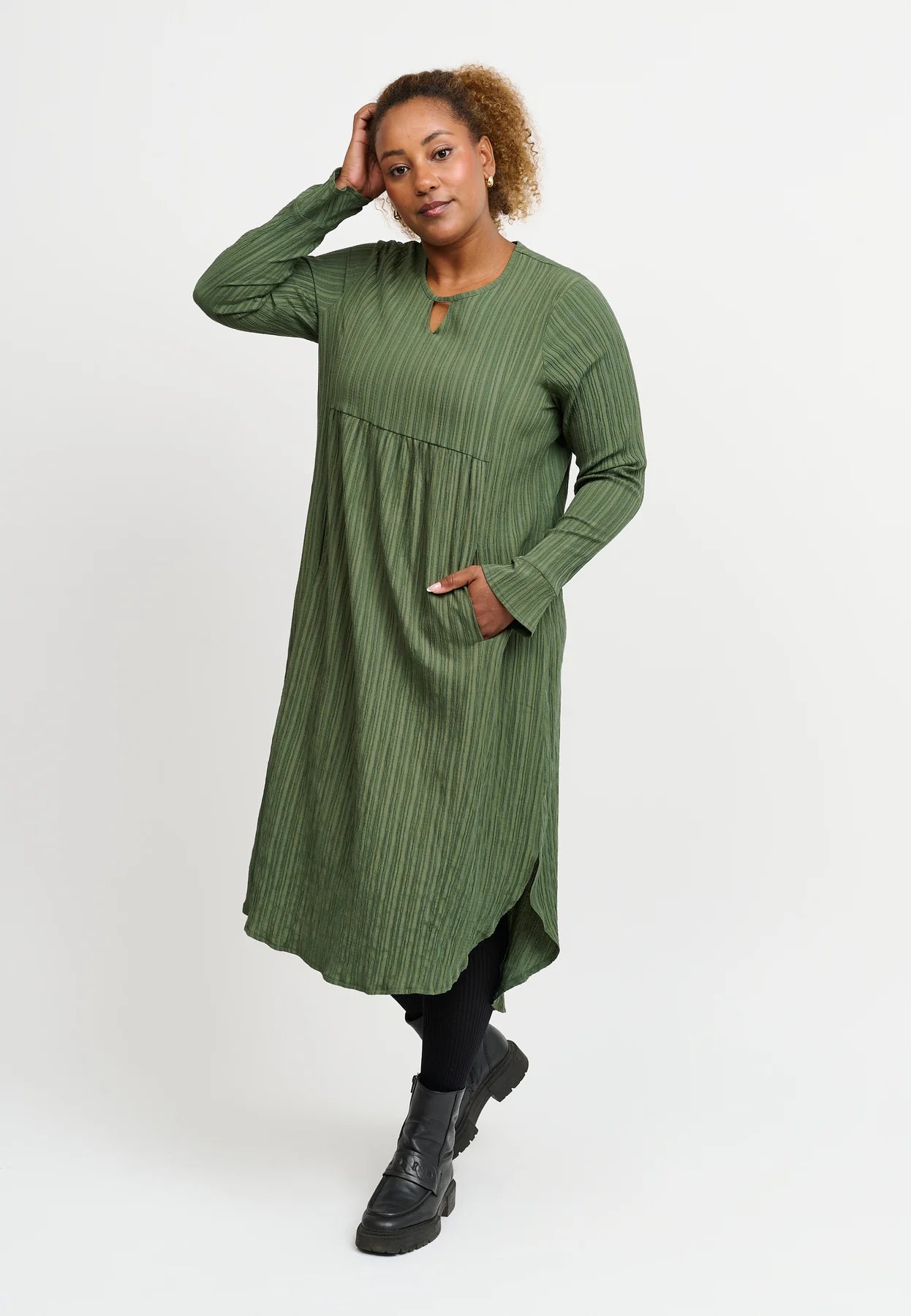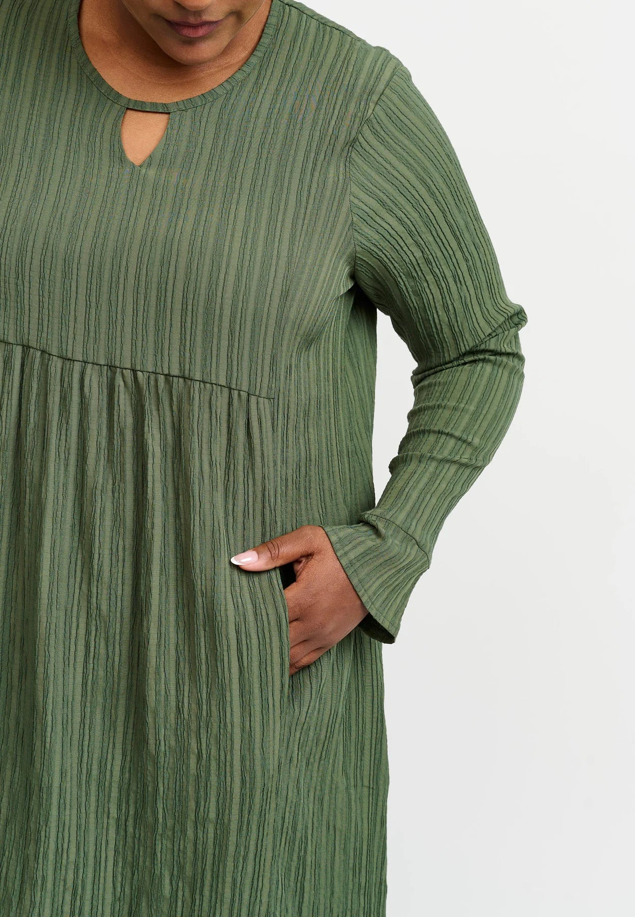 A long and elegant dress in a beautiful army green shade with an asymmetric hemline and relaxed details. The lightly textured fabric offers softness and stretch, while the generous A-line fit ensures comfort. It features long sleeves, a buttoned neckline, and side pockets for a casual yet refined look.