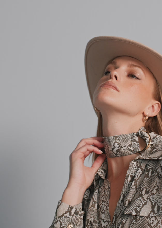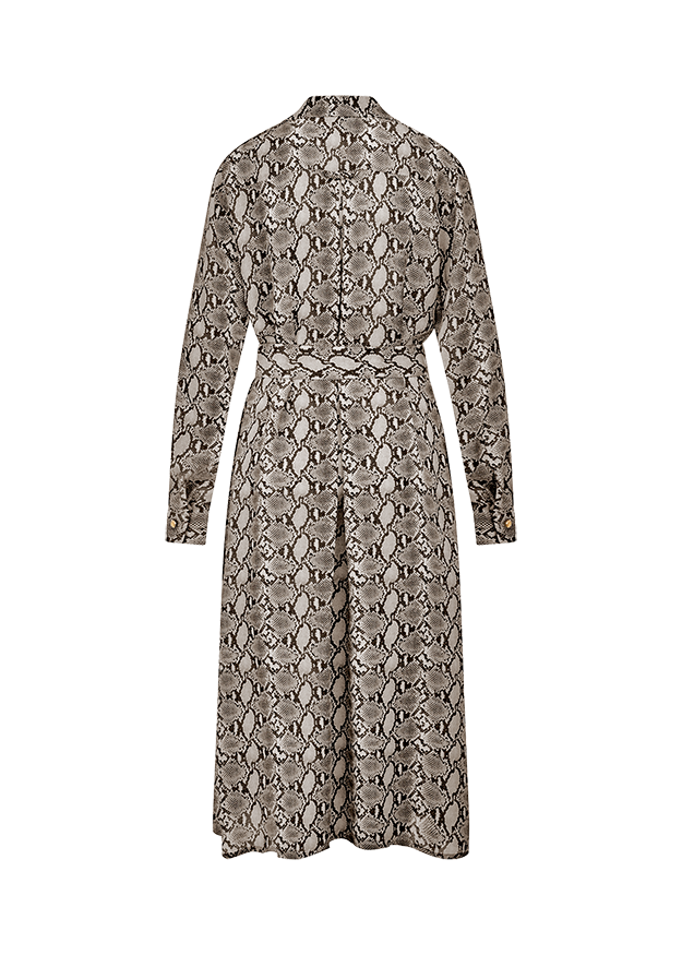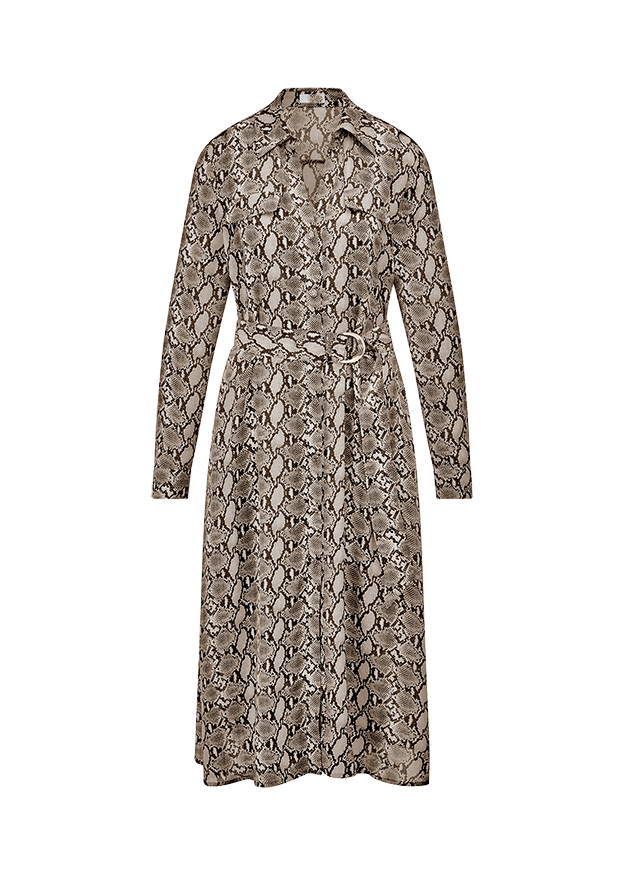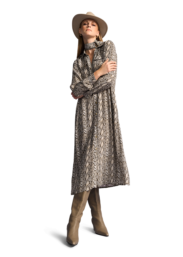 This elegant maxi dress combines feminine chic with an exciting snake print that creates a seductive look. The flowing cut with accentuated waist and classic collar skillfully sets the silhouette in scene and gives the dress a timeless elegance. The long sleeves with cuffs harmoniously round off the design. Made of high-quality viscose, the long dress feels pleasantly light and soft on the skin - perfect for stylish appearances that leave an impression. A must-have for those who appreciate stylish patterns with an elegant fit.