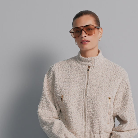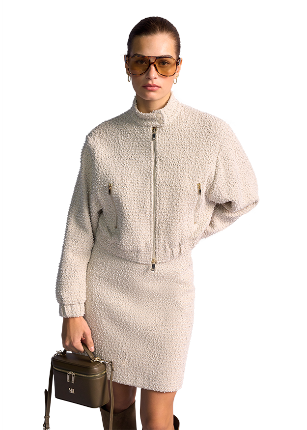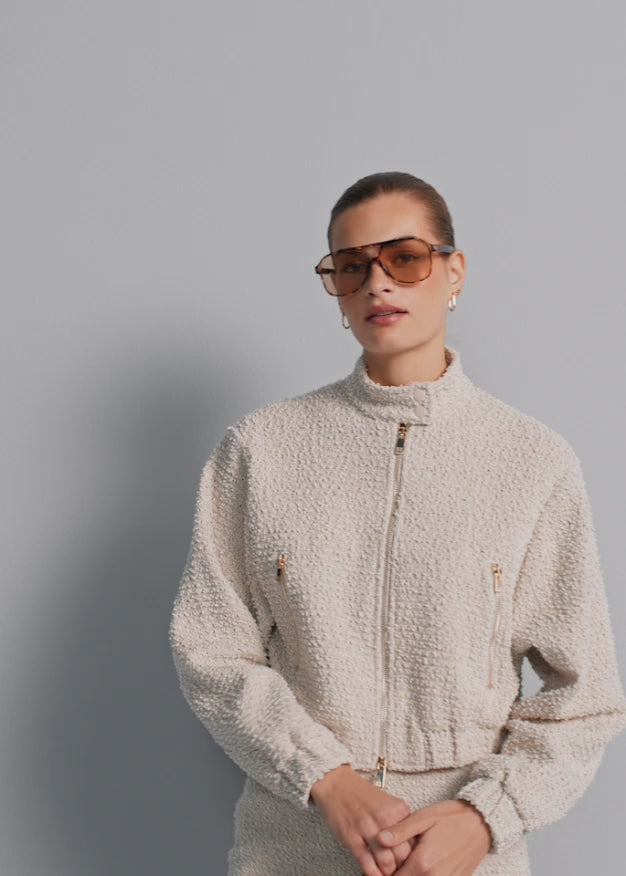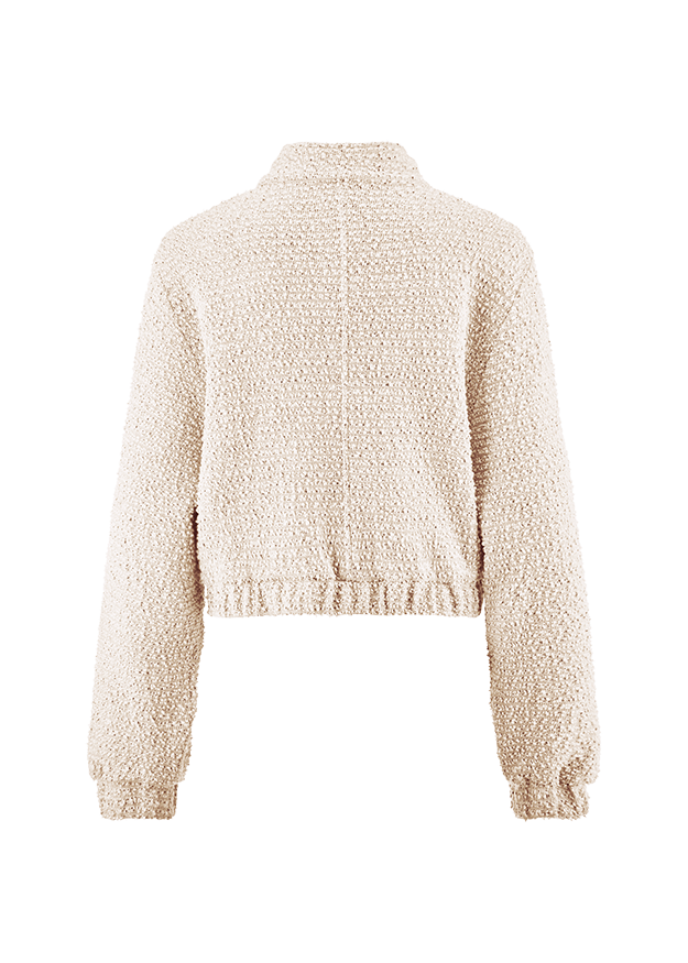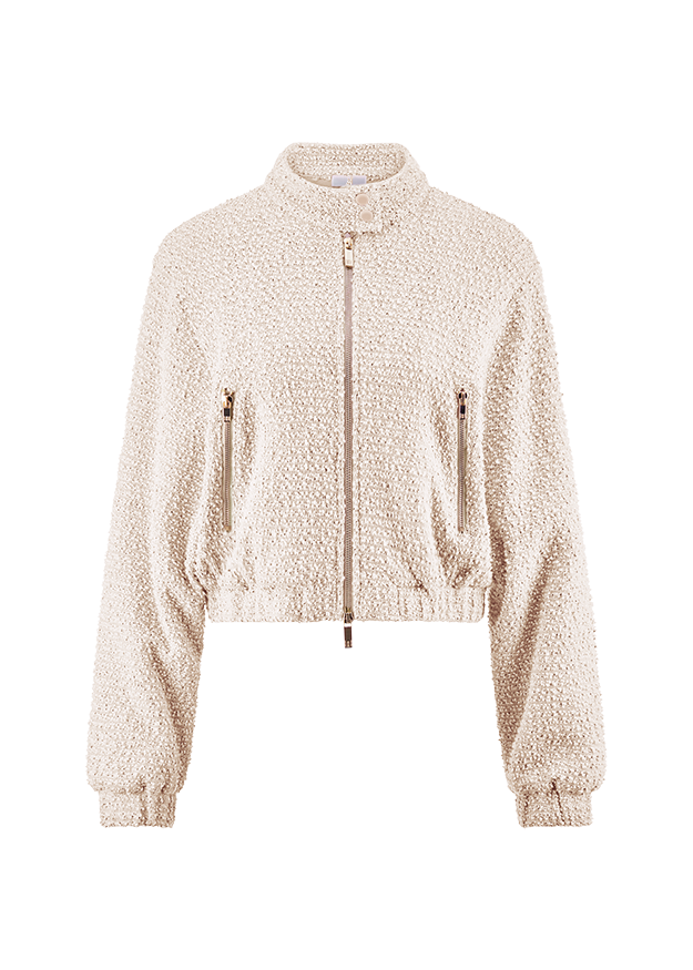 This cropped bouclé jacket combines French elegance with a trendy, modern cut. Made of high-quality bouclé, it impresses with its characteristic, structured surface and the noble shine of the fabric. The shortened cropped cut emphasizes the waist and can be perfectly combined with high-waisted trousers or skirts - ideal for a stylish, feminine outfit.