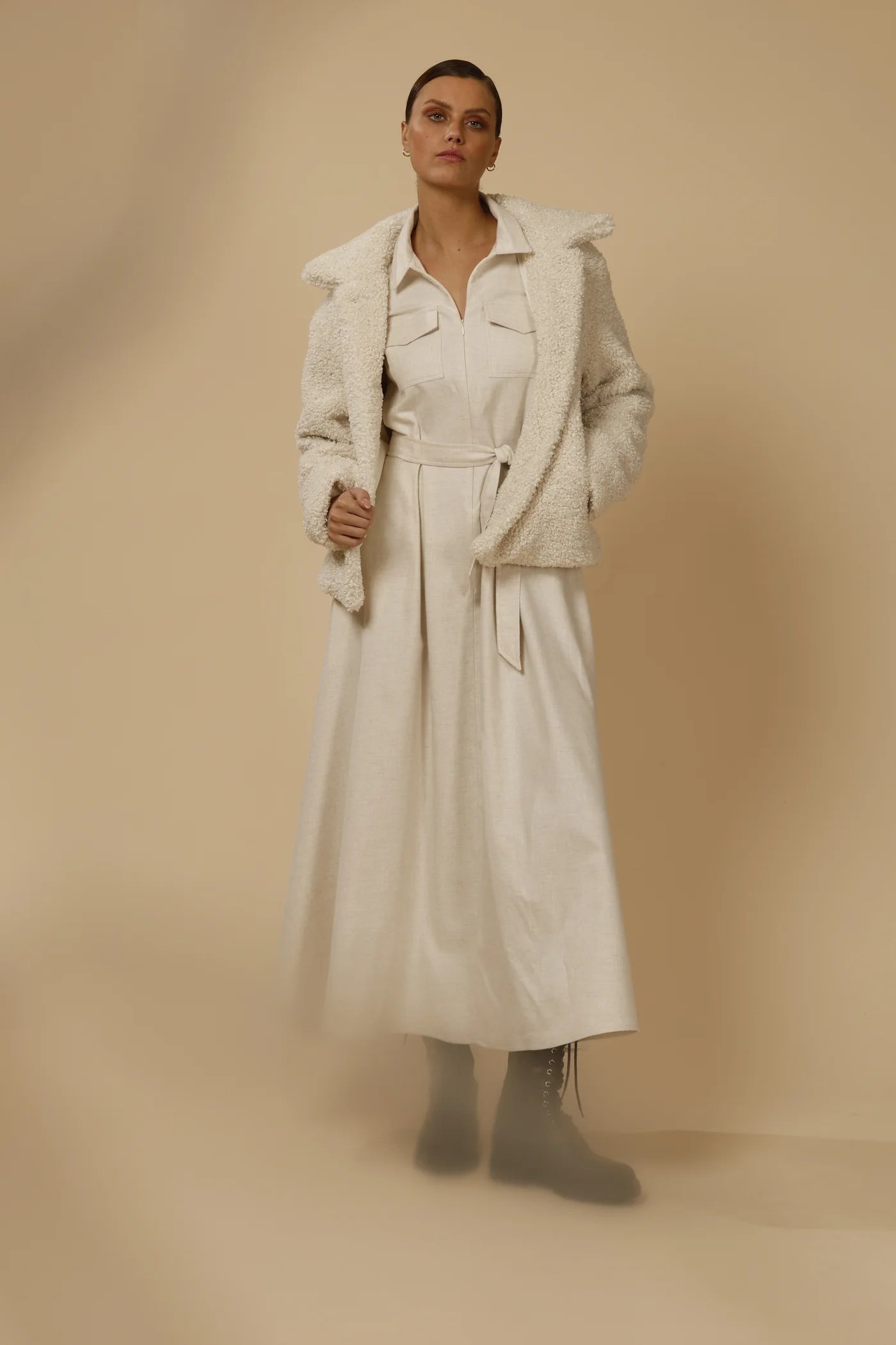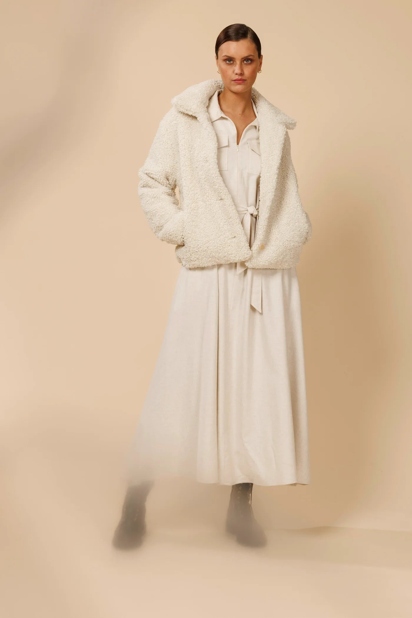 Teddy јакна која спојува топлина и стил заедно и креира модерно класично парче. Направена од мек материјал кој освојува со својот топол комфорт додека дава дотерана, самоуверена силуета. Дизајнирано со едноредно копчење, долги ракави и практични странични џебови, одличен баланс за кежуал елеганција.