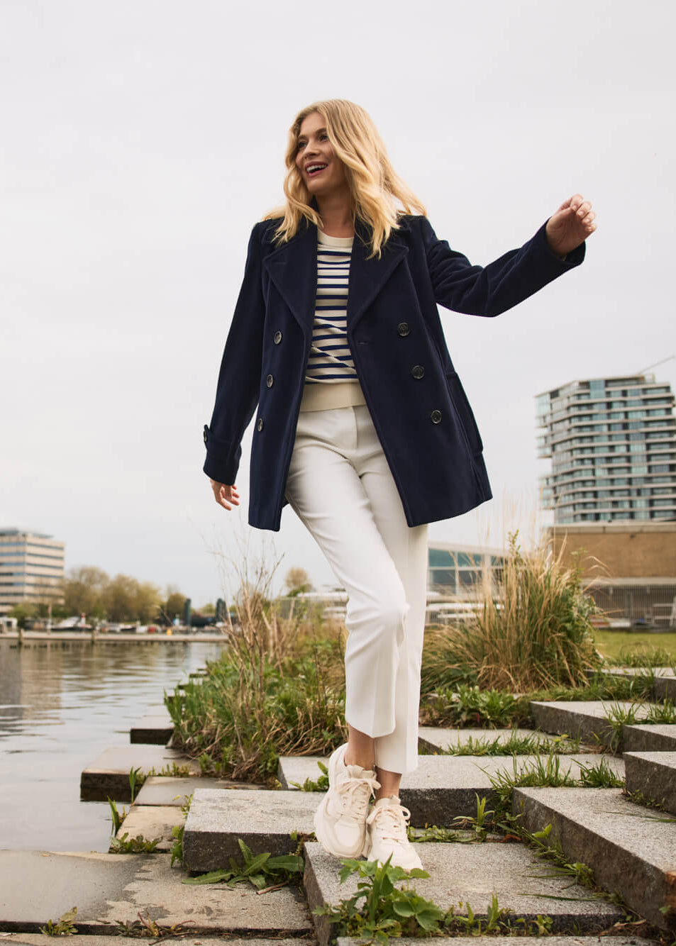 The JANNA women's wool jacket combines a pleasantly soft wool blend with cashmere, ensuring a comfortable fit. The straight cut gives the jacket a loose fit, while the collar adds a subtle touch to the look. This model is ideal for versatile outfits, especially on cooler days.